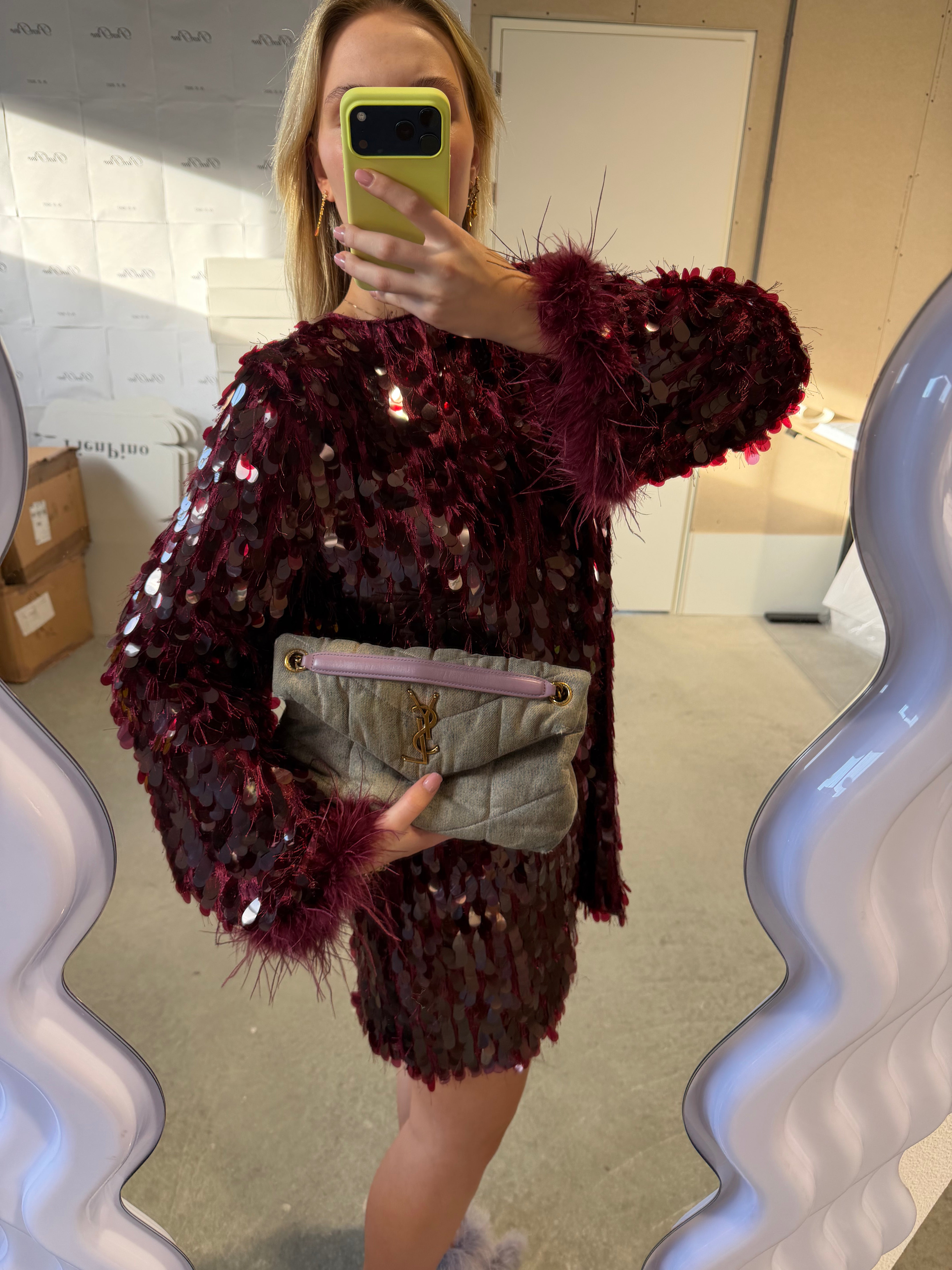 Glimmer Dress in de kleur Bordeaux met mooie veren.