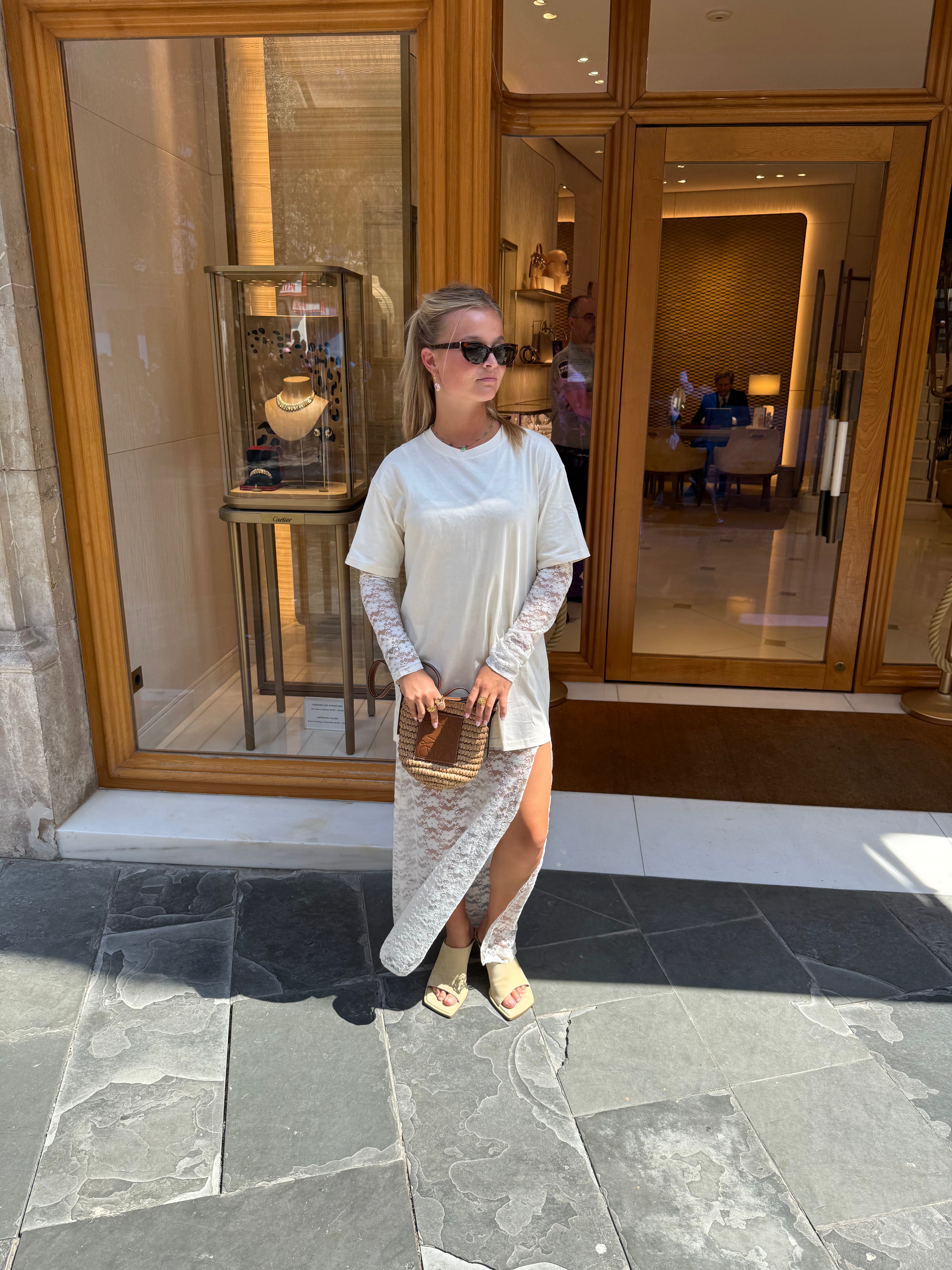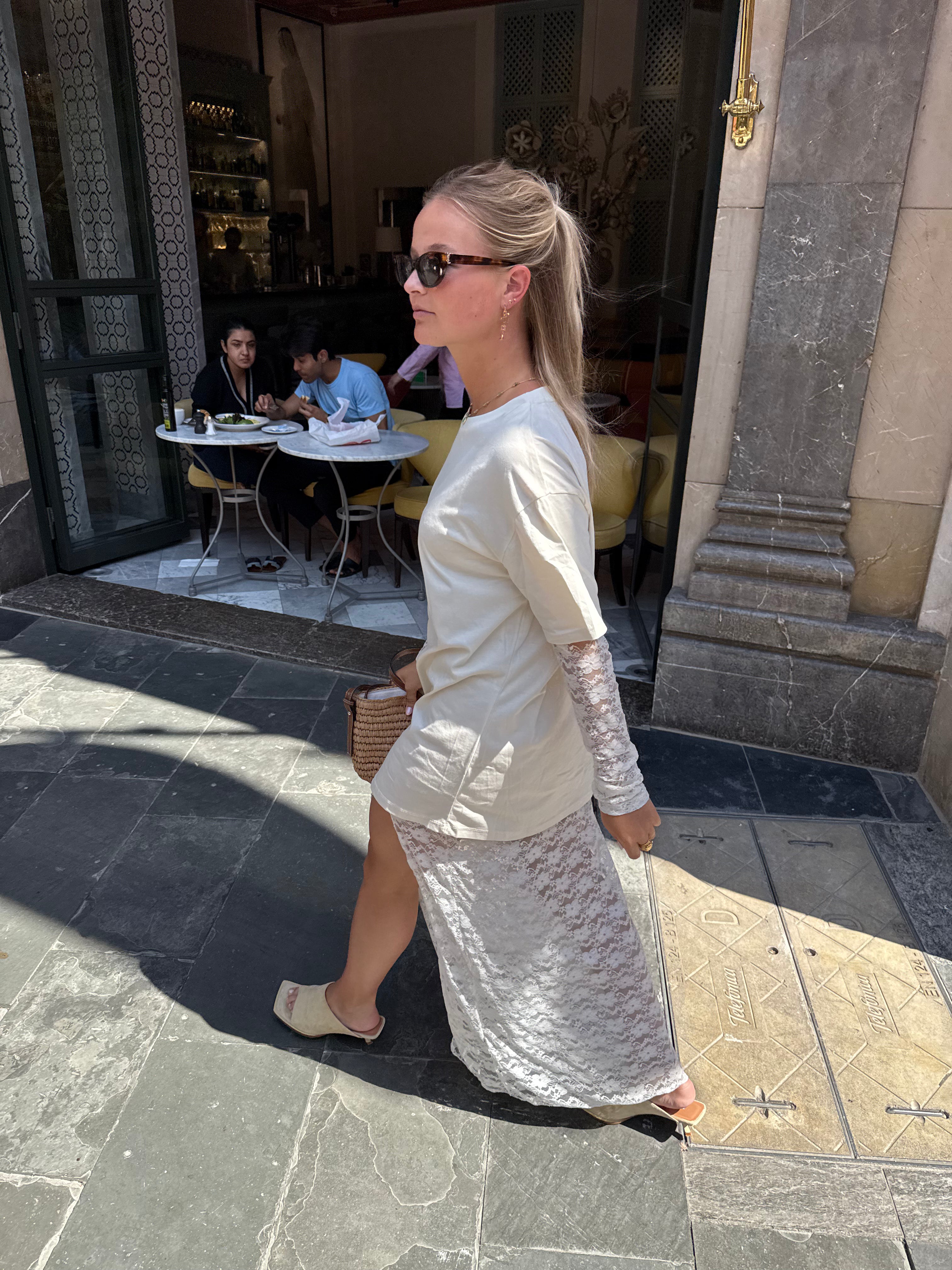 Deze stijlvolle set bestaat uit een elegante kanten rok en een comfortabel katoenen shirt, gemaakt van een hoogwaardige mix van 95% katoen en 5% elastaan. Het katoenen shirt voelt zacht en ademend aan, terwijl de toevoeging van elastaan zorgt voor een lichte stretch en een comfortabele pasvorm. De kanten rok heeft een verfijnde, vrouwelijke uitstraling met een subtiel patroon dat zorgt voor een chique touch.