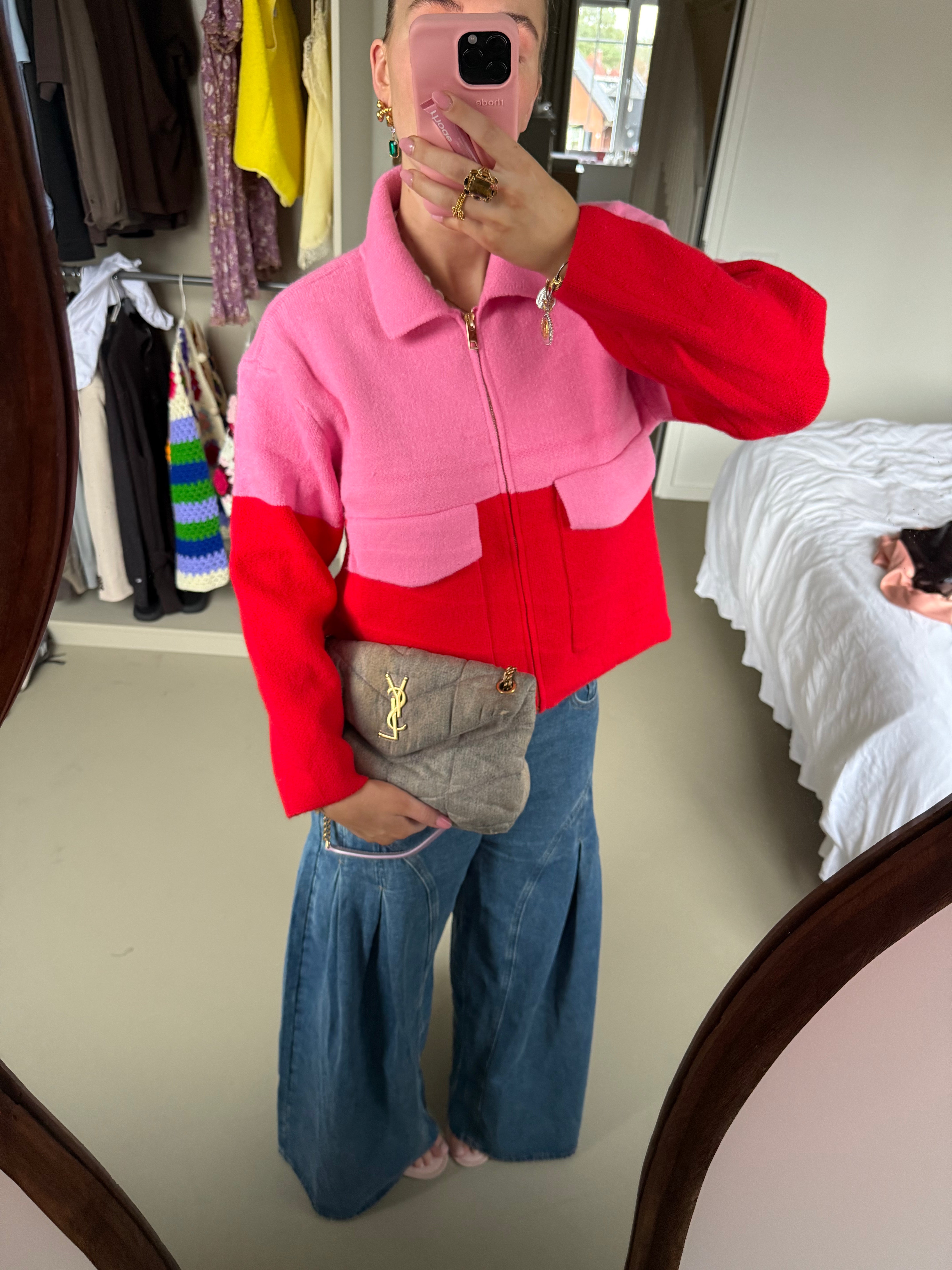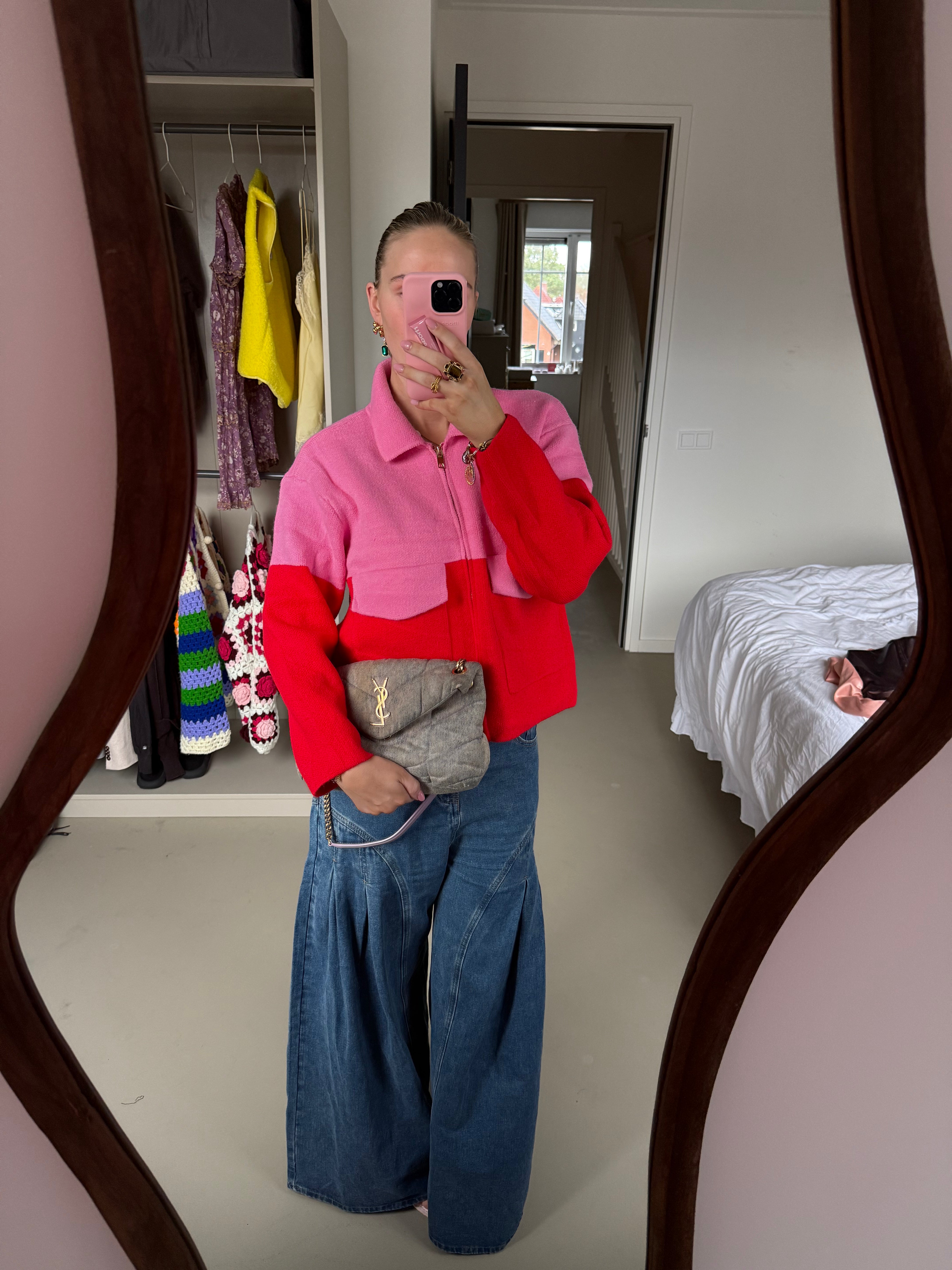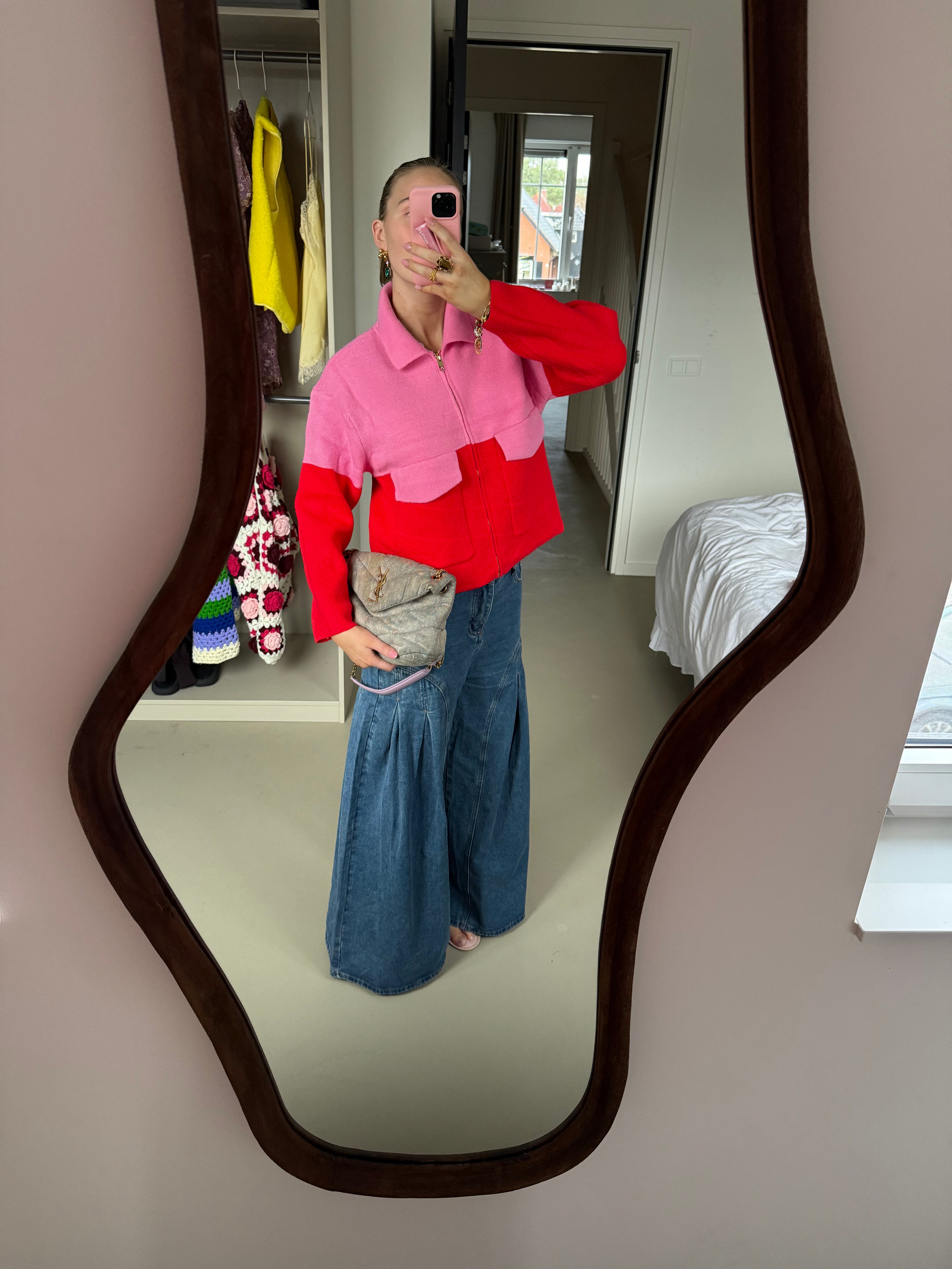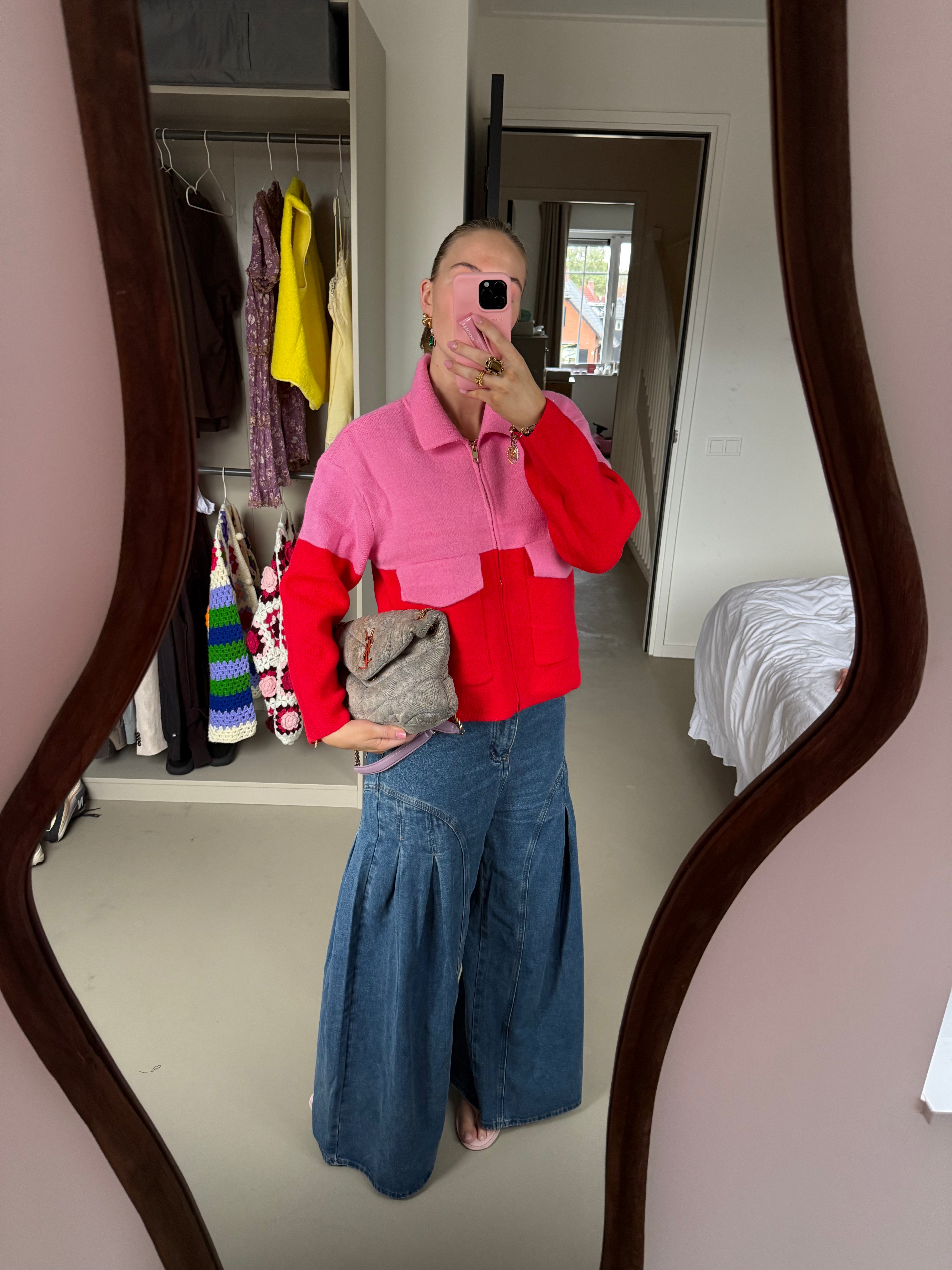 Deze prachtige trui/vest is een echte eyecatcher! De warme combinatie van rood en roze zorgt voor een speelse maar stijlvolle uitstraling. De mooie gouden rits aan de voorkant geeft het geheel een luxe touch en maakt het vest gemakkelijk te dragen, open voor een casual look of dicht voor extra warmte.