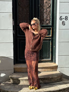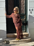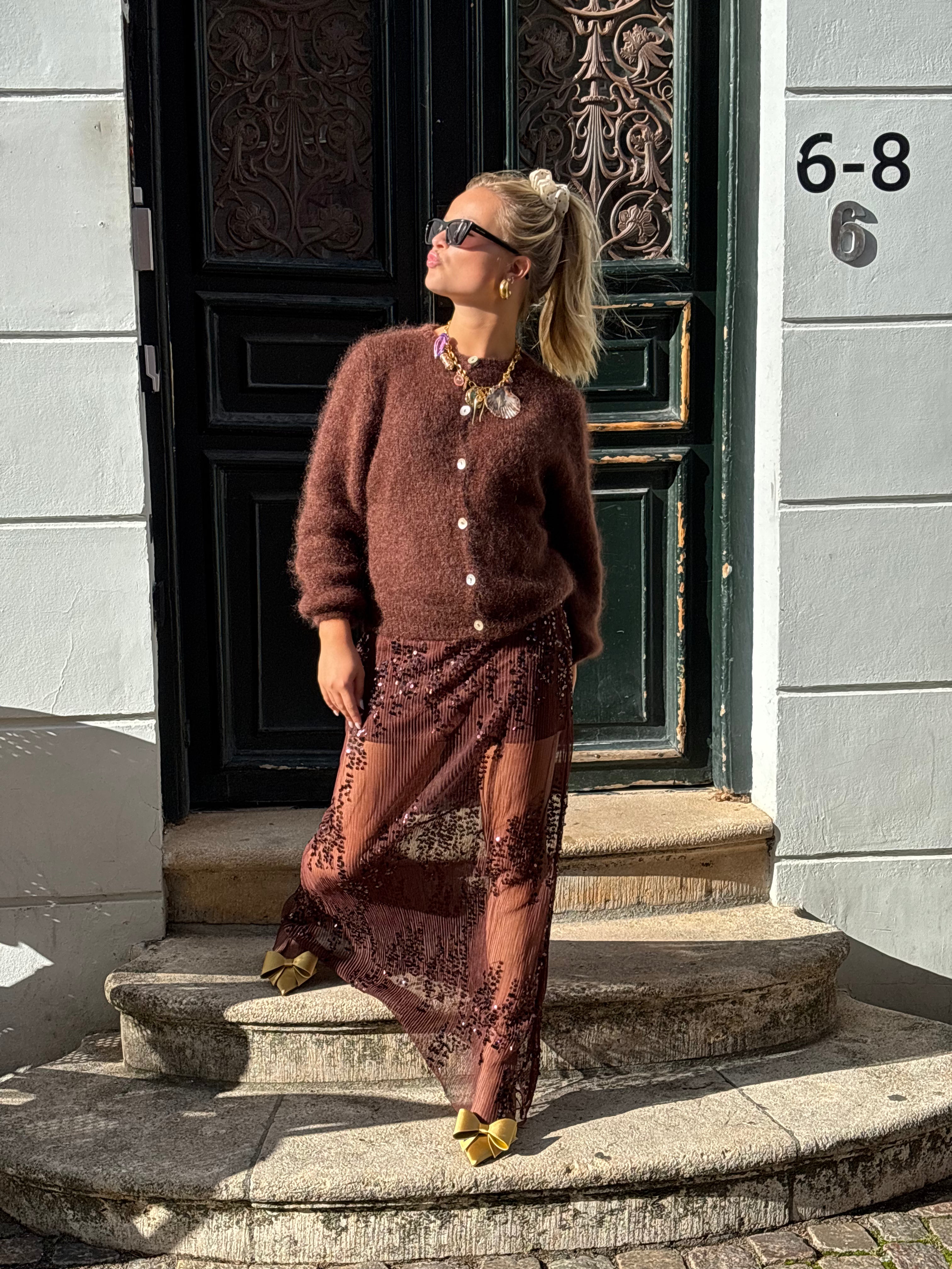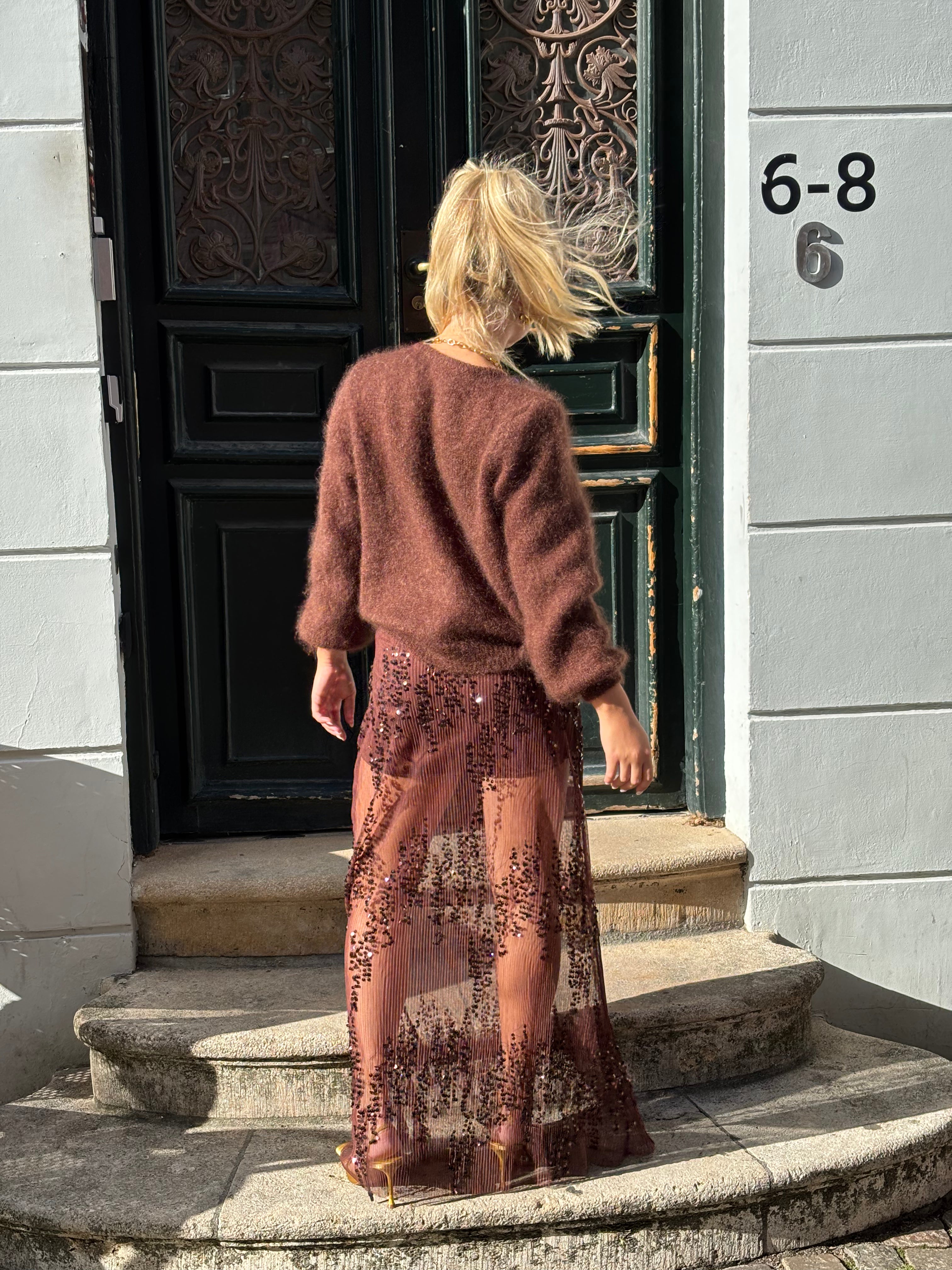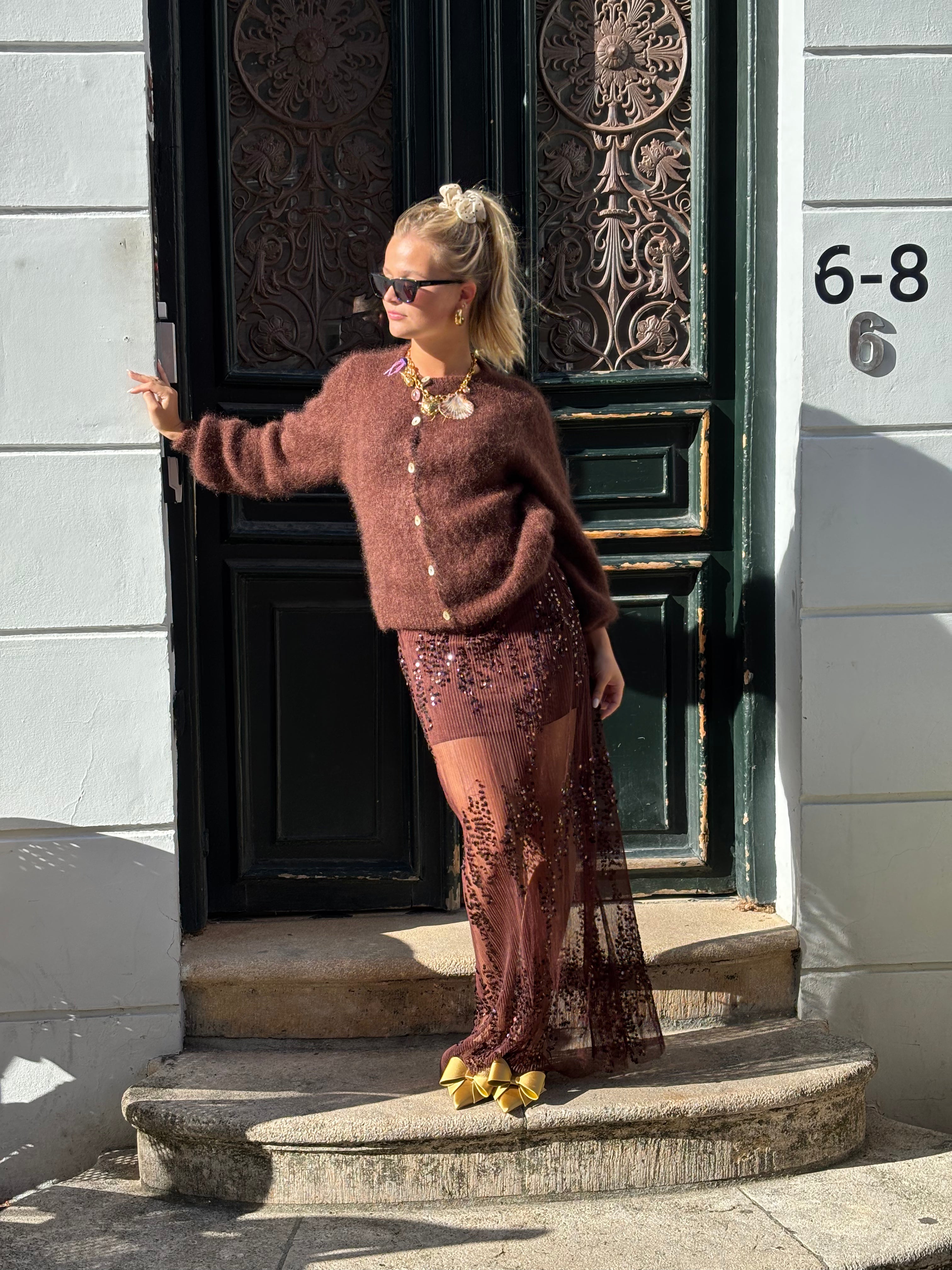 De Night Skirt is dé rok waarmee je moeiteloos een statement maakt. Uitgevoerd in een warme bruine tint met subtiele glitterdetails straalt deze rok elegantie én feestelijkheid uit. Het licht rekbare materiaal zorgt voor een comfortabele fit en een mooie vrouwelijke pasvorm. Perfect te stylen met een chique top voor een avondje uit, maar ook leuk met een cozy knit voor een speelse everyday look.