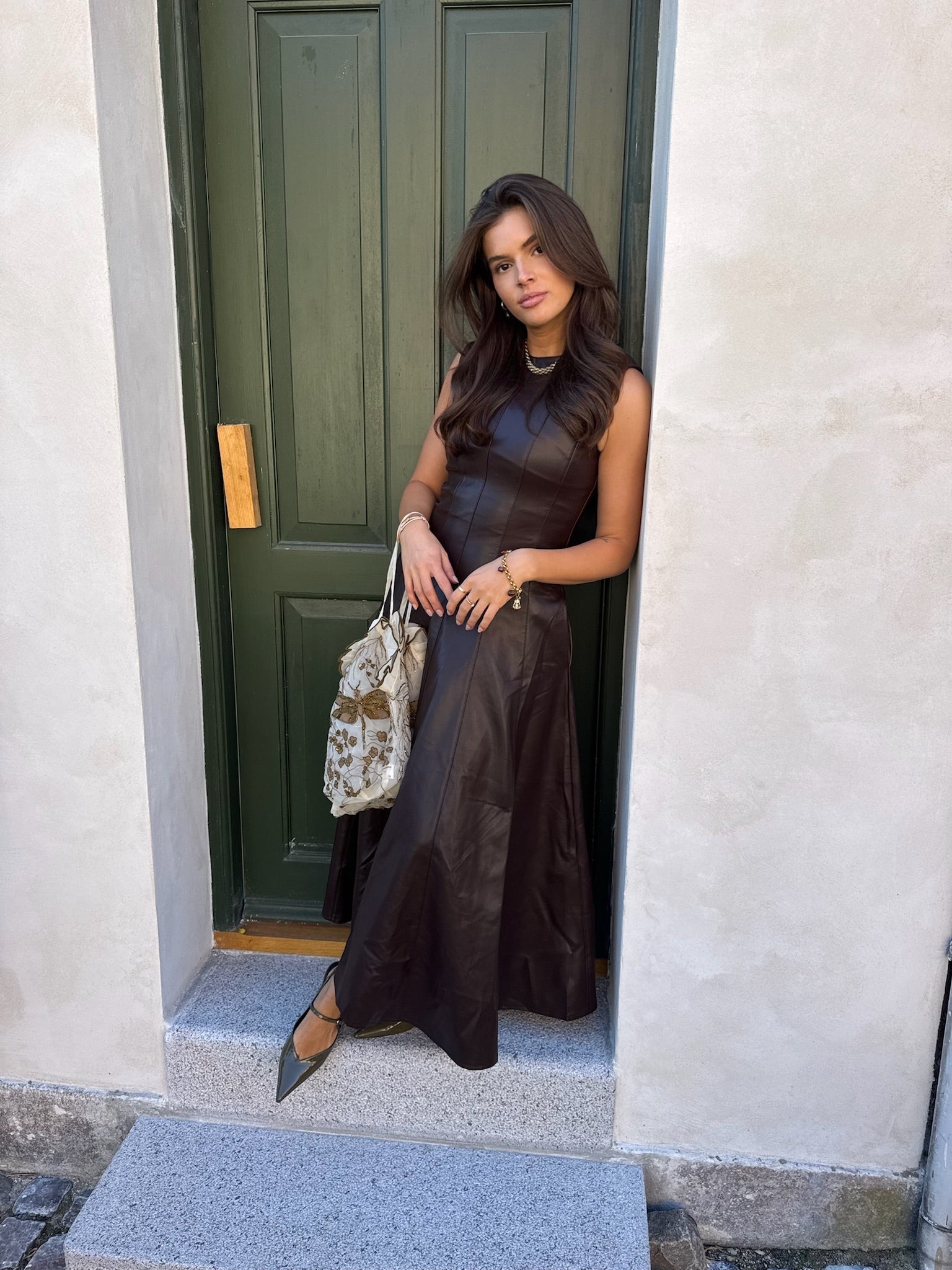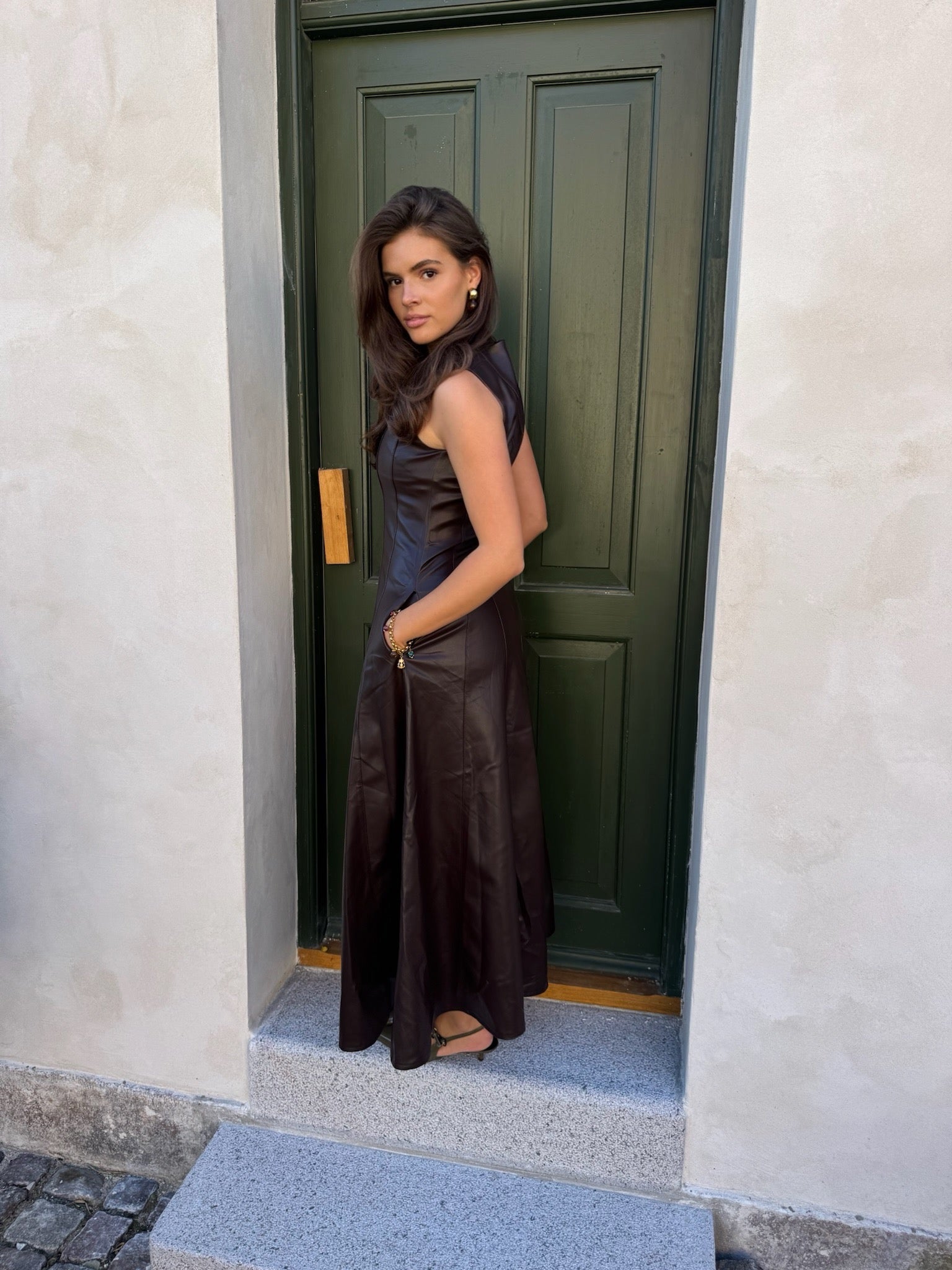Deze prachtige jurk combineert een stoere uitstraling met een vrouwelijke pasvorm. Gemaakt van een hoogwaardige leather look stof (100% polyurethaan, 88% viscose en 12% polyester), waardoor de jurk soepel valt en toch die elegante leerlook heeft. De viscose zorgt voor een zachte touch, terwijl de polyestervezels bijdragen aan duurzaamheid en comfort. Perfect voor een avond uit of een statement look overdag.