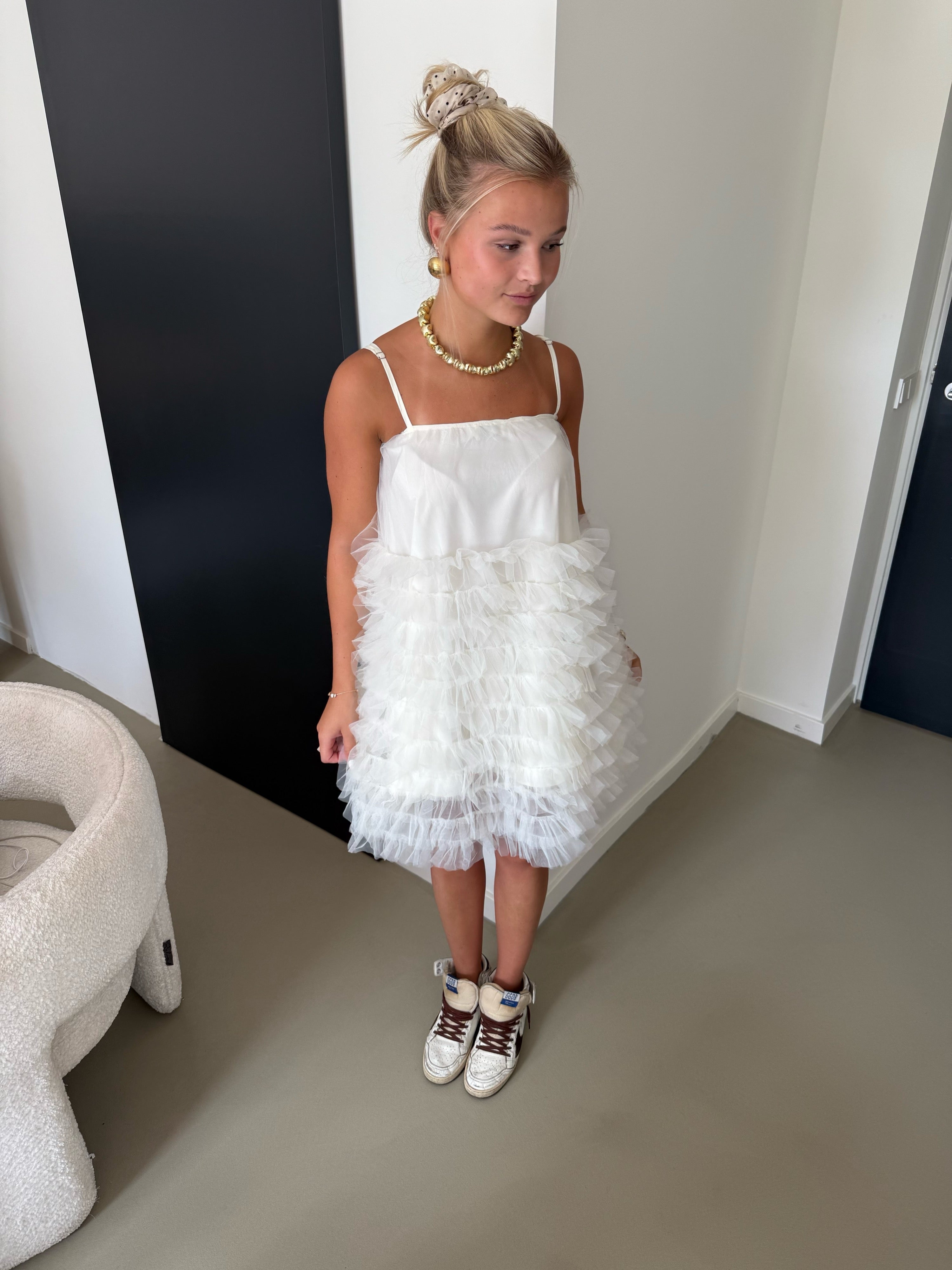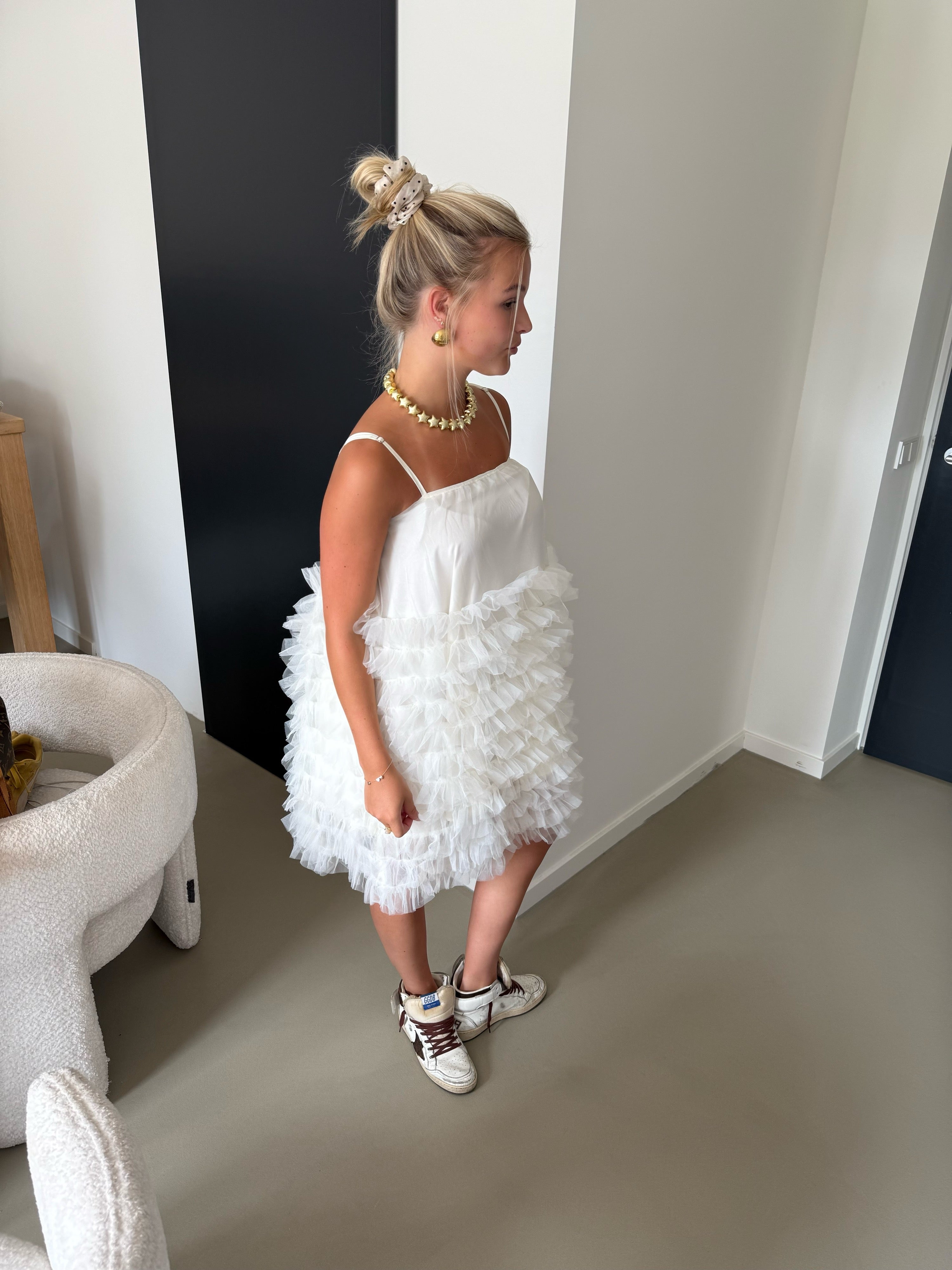 Deze prachtige crèmekleurige jurk is een echte blikvanger. De zachte, neutrale tint straalt klasse en verfijning uit, terwijl de sierlijke franjes langs de zoom en mouwen zorgen voor een speelse, boho-chique touch. De jurk heeft een losvallende pasvorm die elegant om het lichaam valt en geschikt is voor verschillende lichaamstypes, one size fits most.