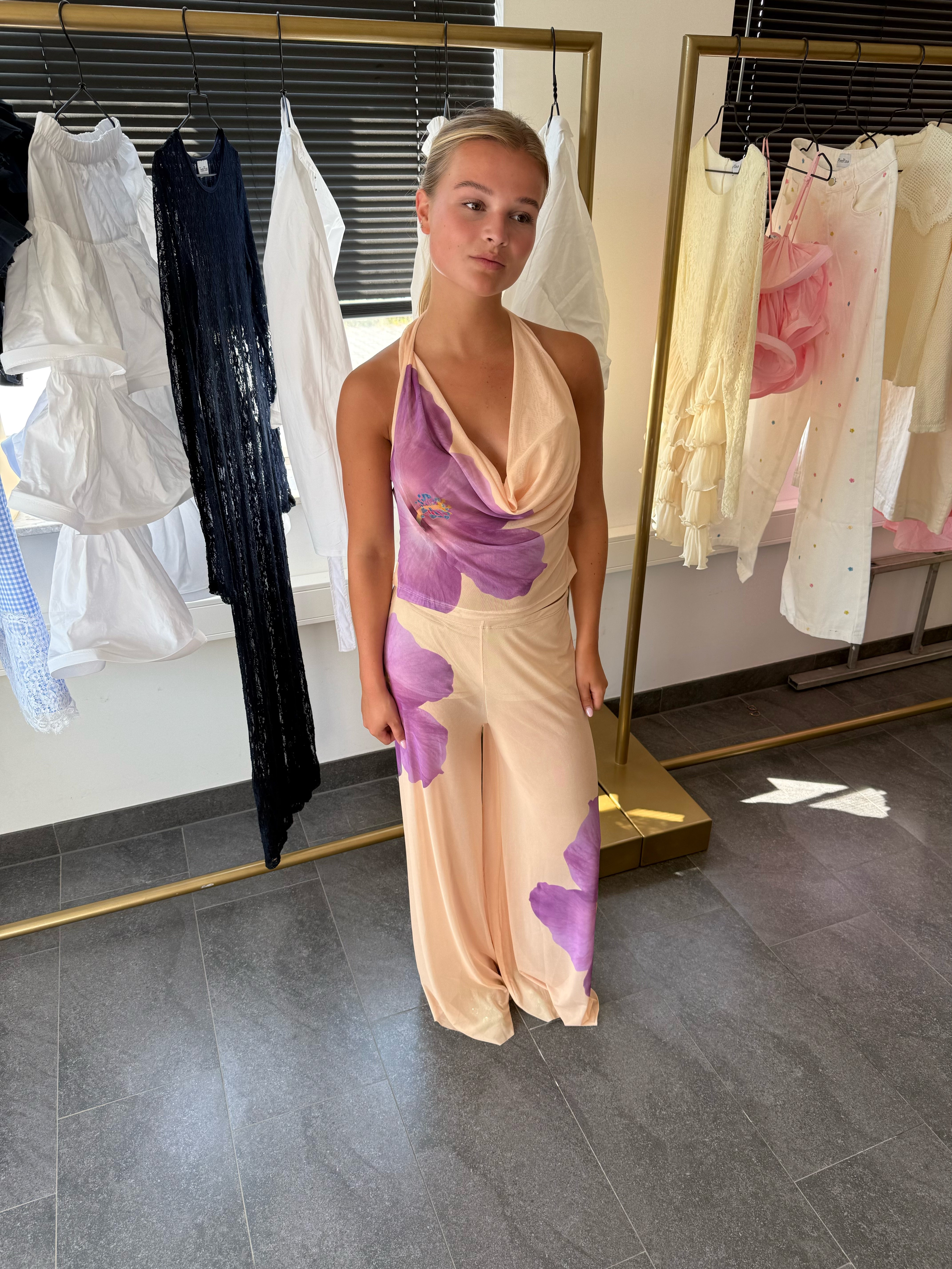 Stap stijlvol de zomer in met dit prachtige, exclusieve pak in een warme, rijke crème/paarse kleur. De set bestaat uit een elegante broek en een mouwloze top, die samen een verfijnde en frisse uitstraling creëren. Als prachtig detail is de top afgewerkt met een opvallende oranje bloem, wat een speelse en unieke touch toevoegt aan de look. Perfect voor zonnige dagen en bijzondere gelegenheden waarbij je wilt uitblinken met een combinatie van eenvoud en exclusiviteit.
