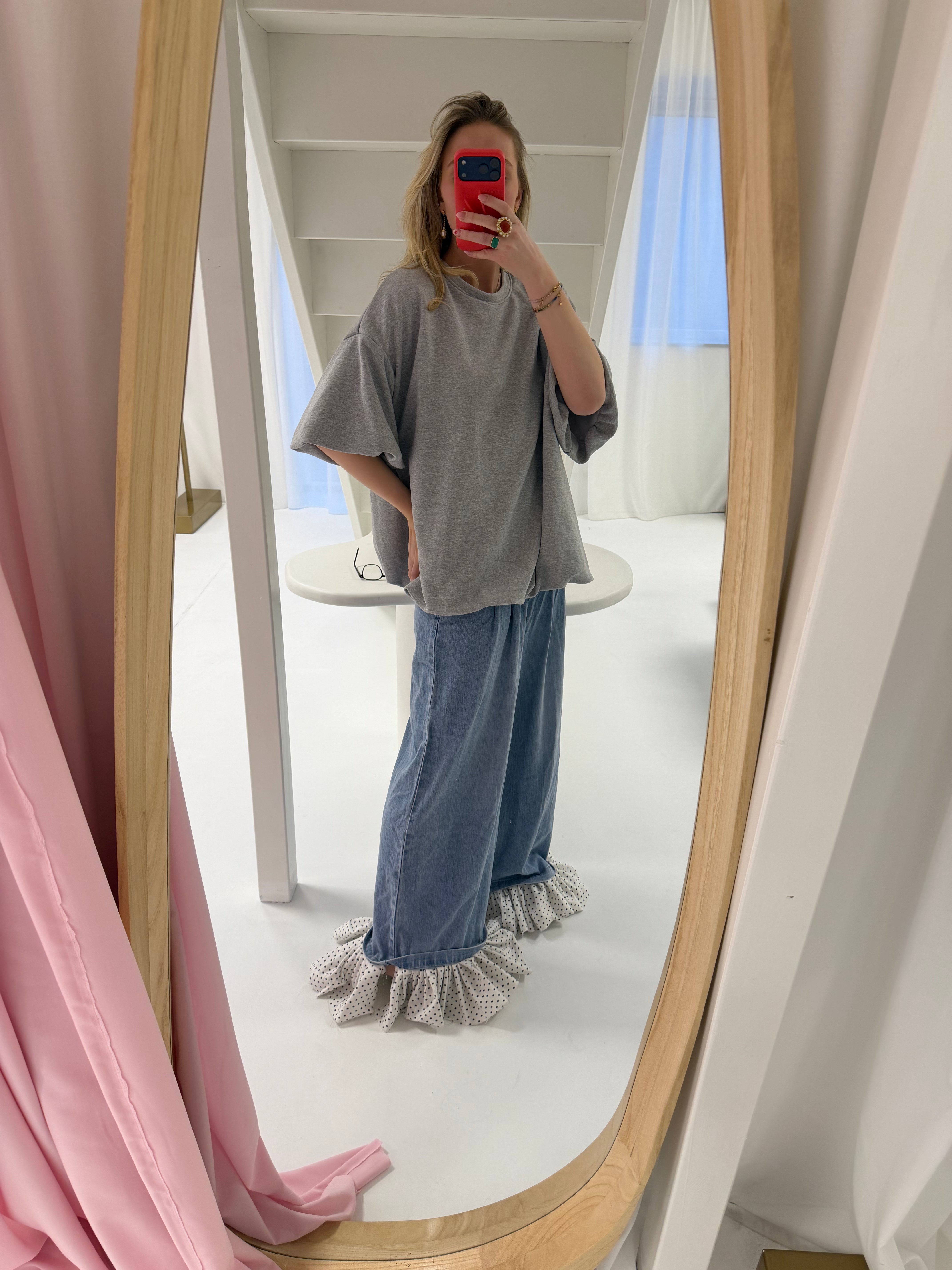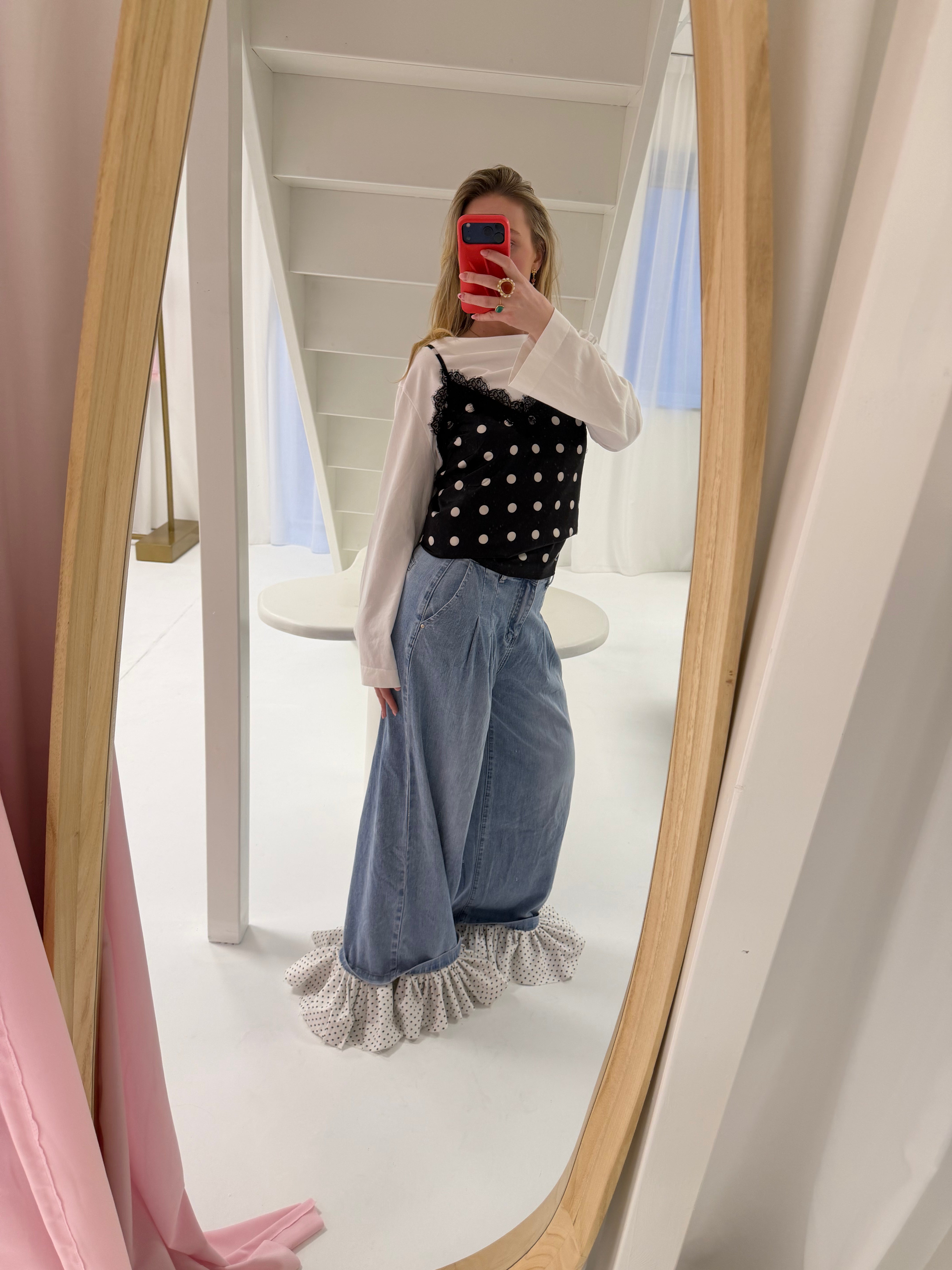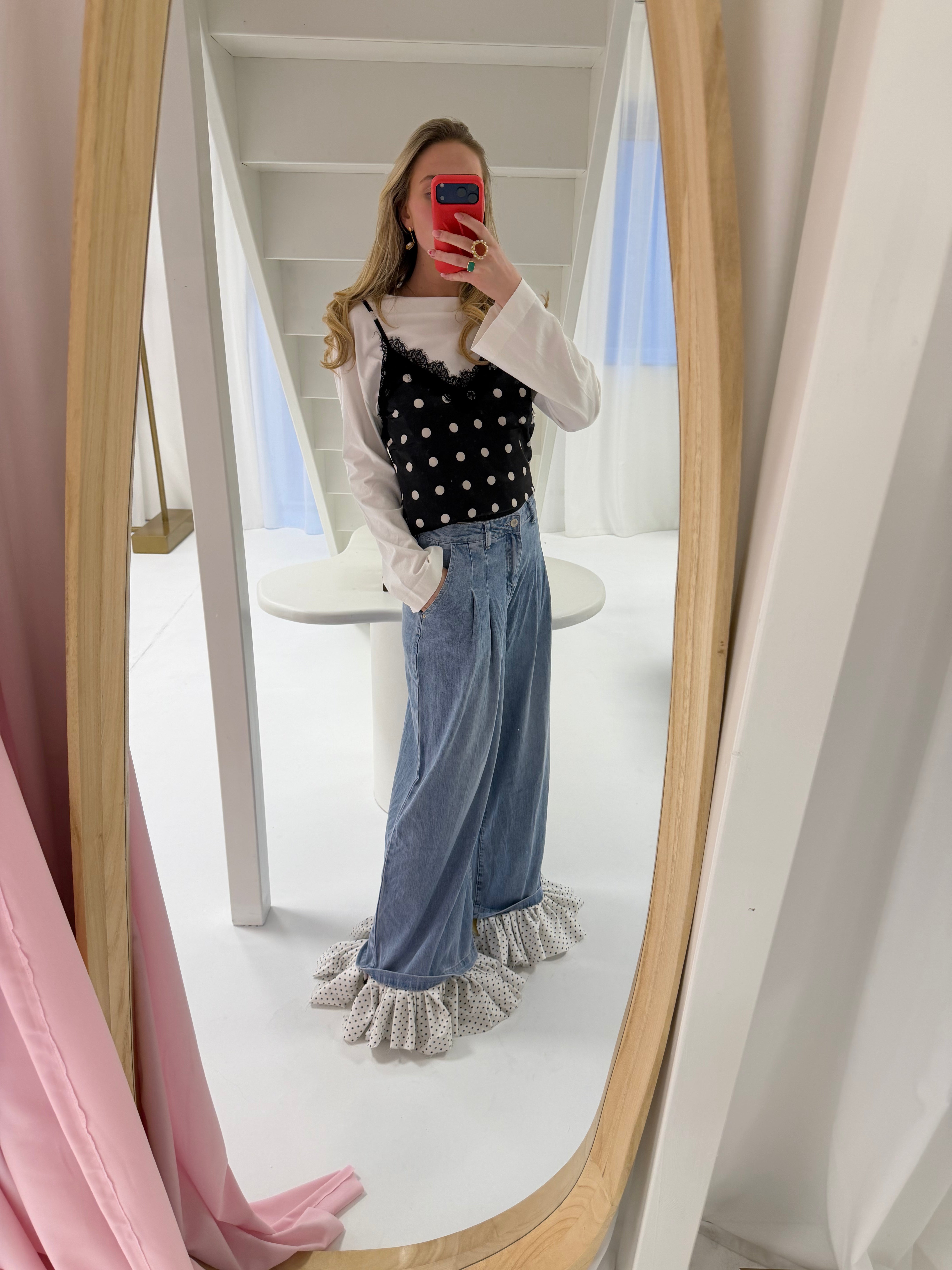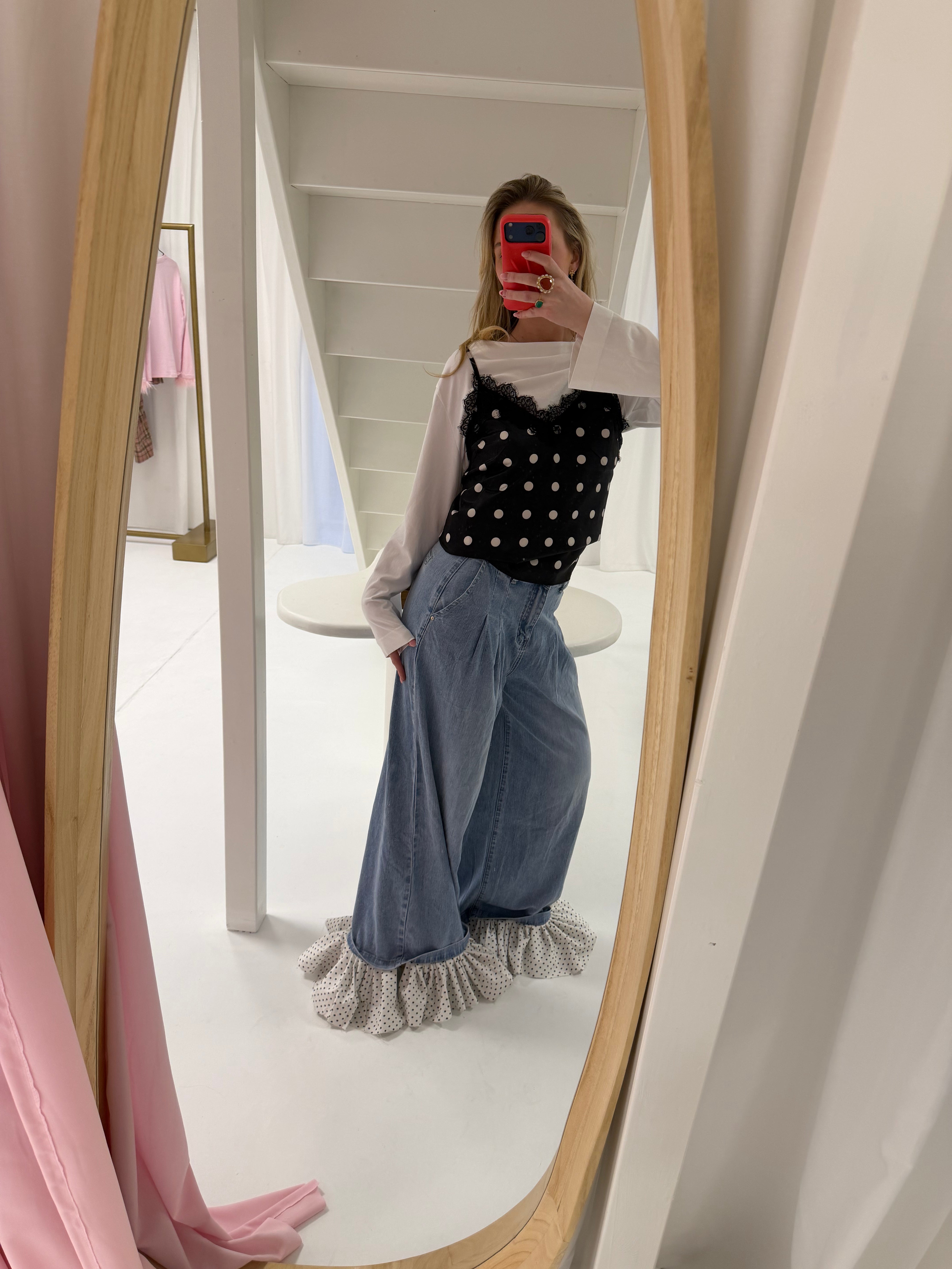 Handgemaakte stippen jeans met een prachtige ruffle aan de onderkant voor een speelse, vrouwelijke uitstraling. Perfect voor zowel casual als geklede looks. Het model op de foto is 1,74 meter en draagt maat L.