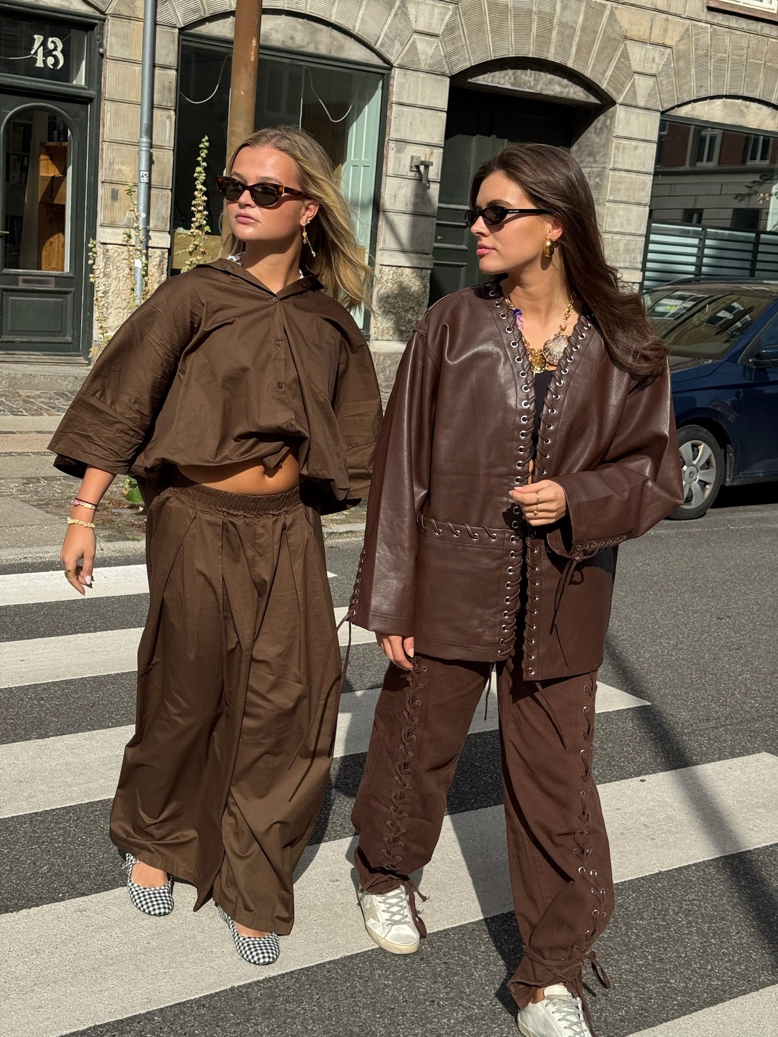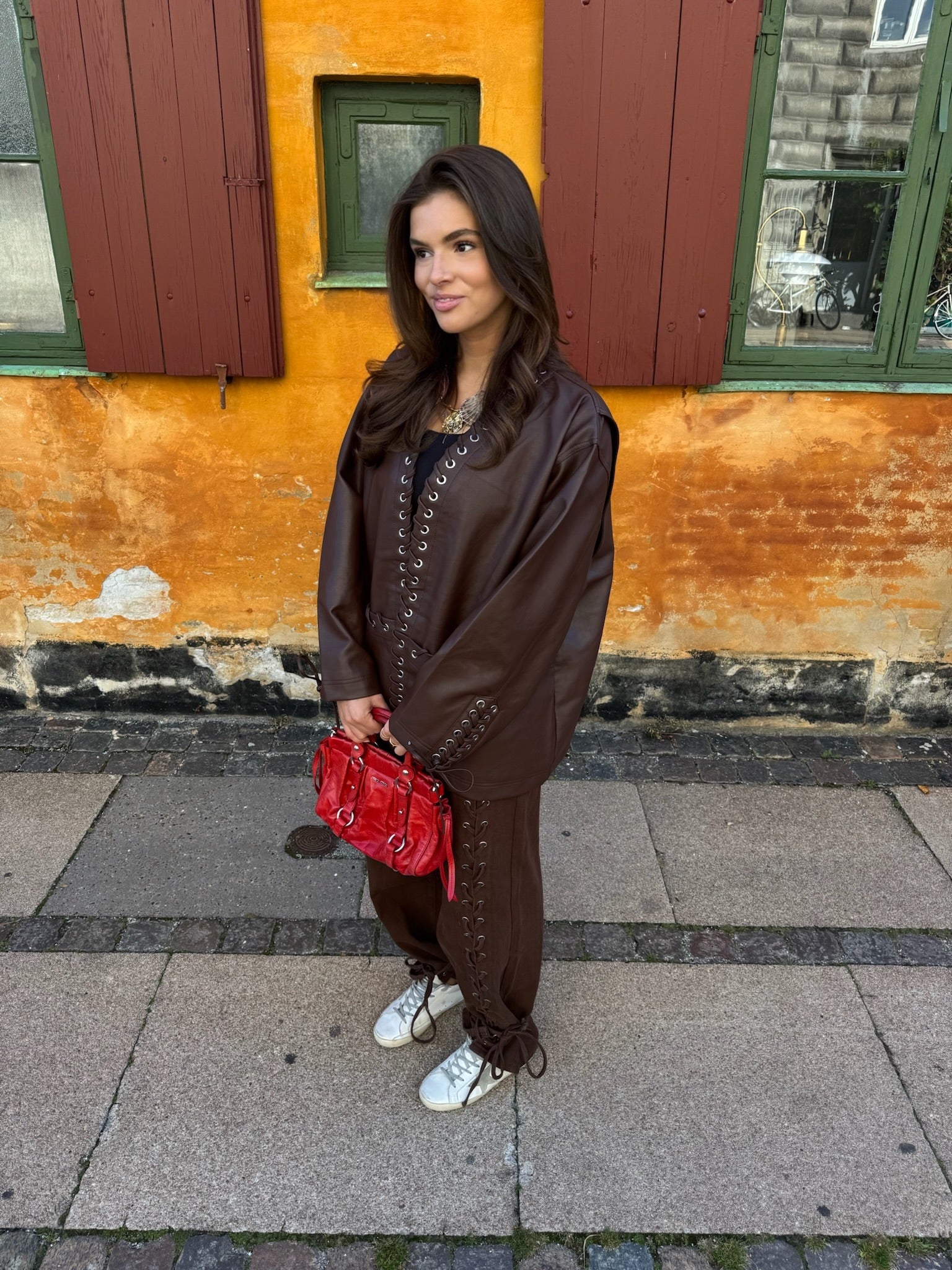 Deze jas combineert een stoere uitstraling met een elegante pasvorm. Gemaakt van een hoogwaardige leather look stof (100% polyurethaan, 85% polyester en 15% viscose). Het polyurethaan zorgt voor de duurzame leerlook, terwijl de mix van polyester en viscose de jas soepel, comfortabel en licht maakt. Perfect te dragen als statement piece over zowel casual als chique outfits.