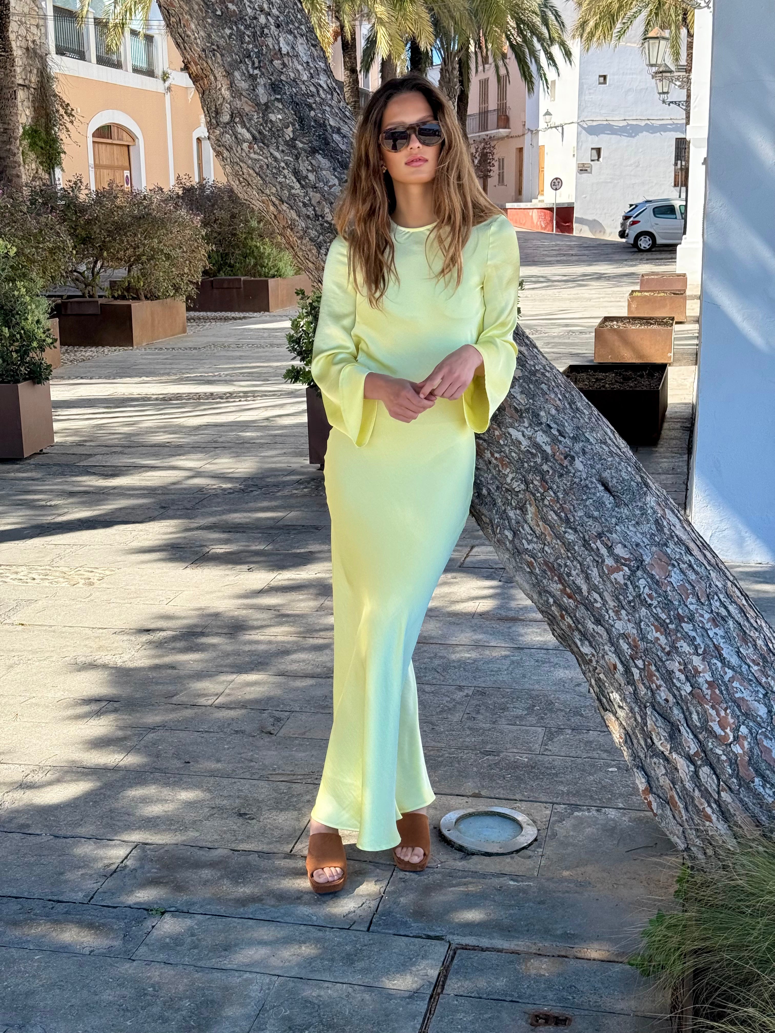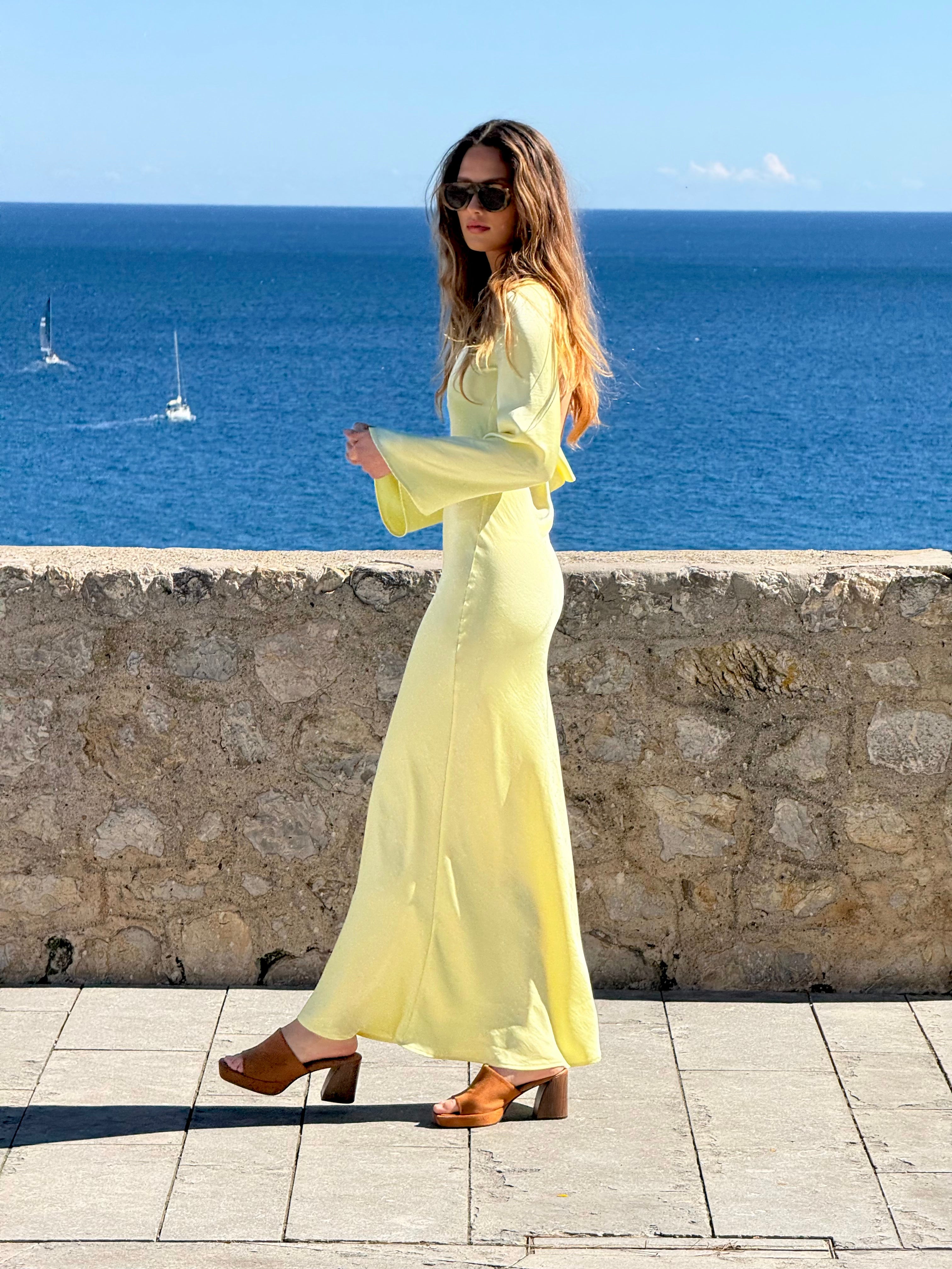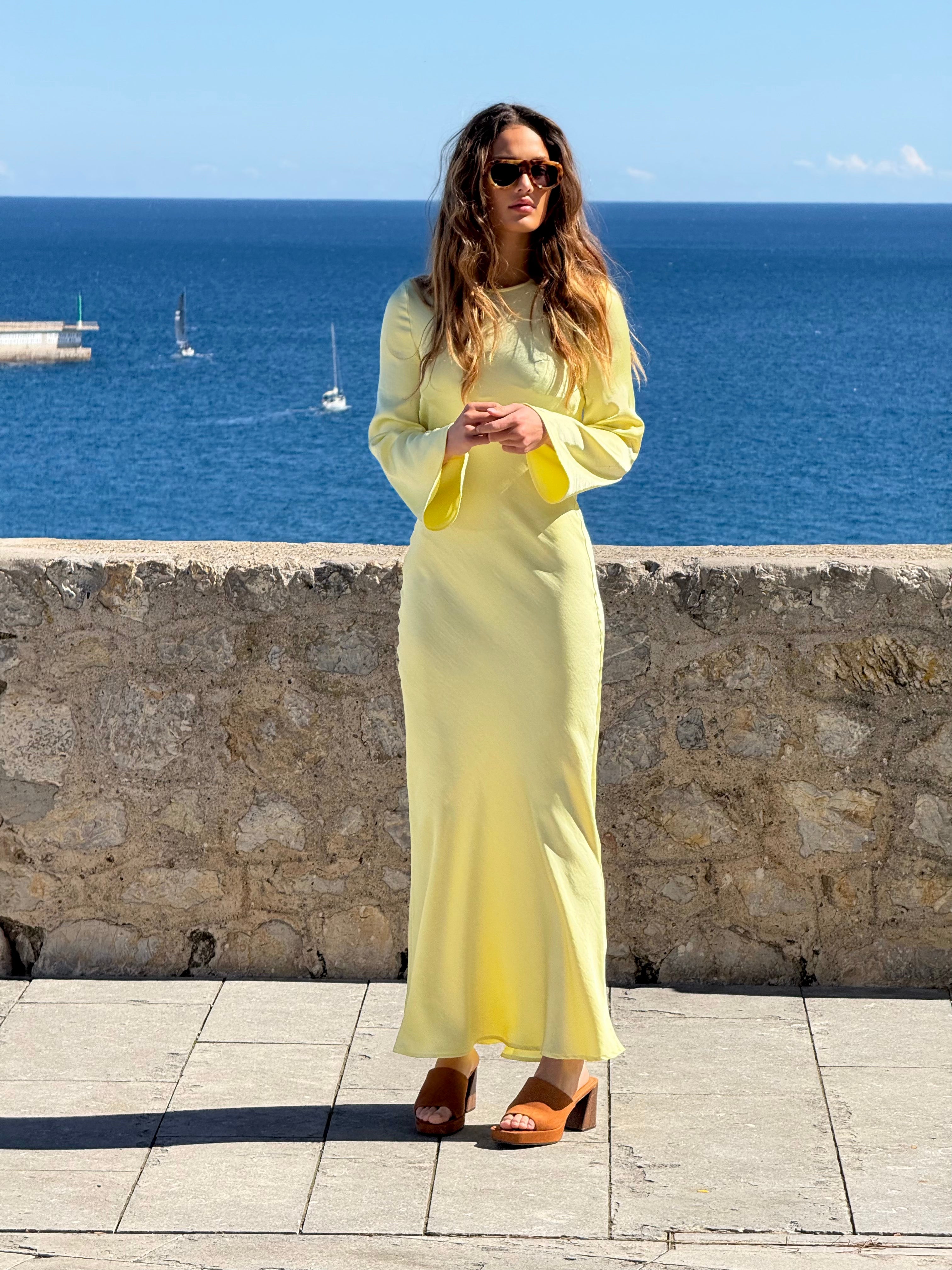 Deze prachtige lange gele jurk is een echte showstopper! Gemaakt van 100% polyester, heeft de jurk een luxe uitstraling en valt mooi langs je lichaam. De open rug zorgt voor een elegante en gedurfde touch, terwijl de lange uitlopende mouwen het geheel een verfijnde en romantische uitstraling geven. De drukknoopjes bij de hals zorgen voor een subtiele sluiting die de chique look compleet maakt.