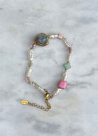 Deze handgemaakte armband is gemaakt uit diverse kralen en heeft een roestvrijstalen afwerking. Dankzij onze handige sluiting is de armband eenvoudig verstelbaar, waardoor hij perfect past voor elke gelegenheid. Elegantie en veelzijdigheid in één uniek sieraad.