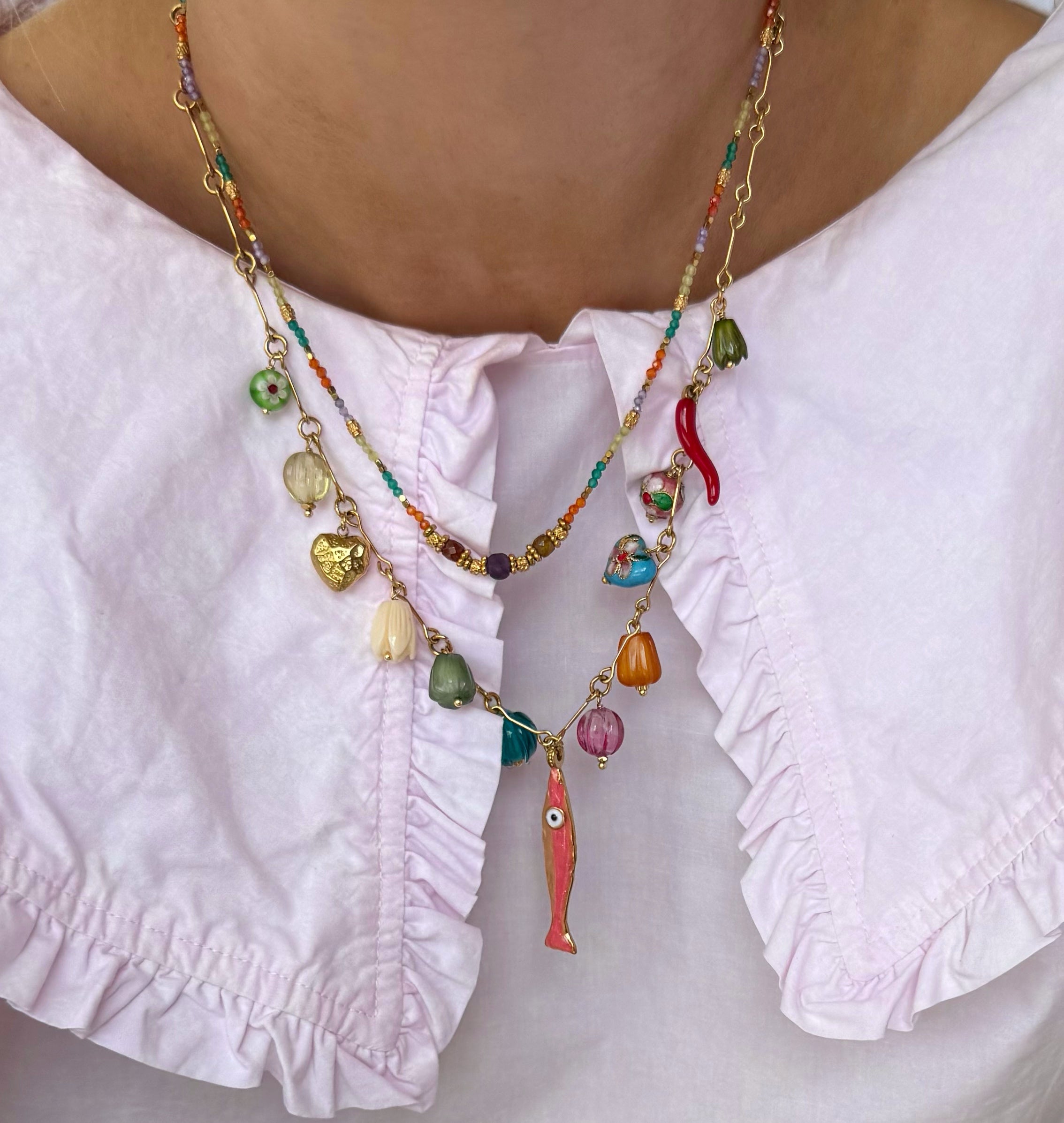 Deze fijne bovenste kralenketting is met liefde met de hand geregen en vormt de perfecte aanvulling op je sieradencollectie. De ketting bestaat uit kleurrijke mini-kraaltjes, subtiel op een rij gezet, waardoor hij een speelse en stijlvolle uitstraling heeft.