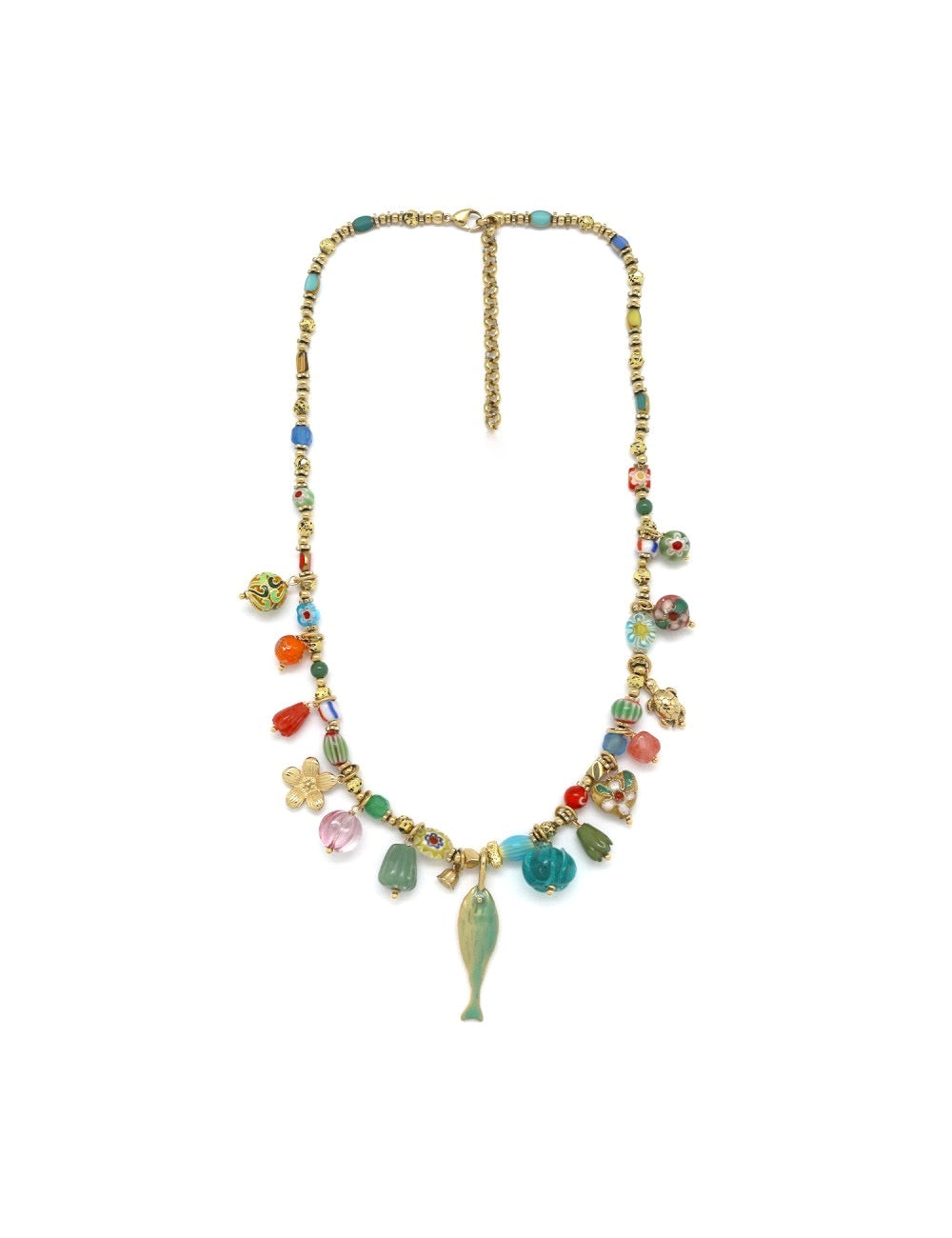 De ketting heeft een totale lengte van 44 cm, met een extra 7 cm verlengstuk voor een verstelbare pasvorm. Het middelpunt van dit sieraad is een prachtige cloisonné-emaillen bol, rijk aan detail en kleur, gecombineerd met levendige groene visvormige kwasten die een speelse maar verfijnde uitstraling geven.