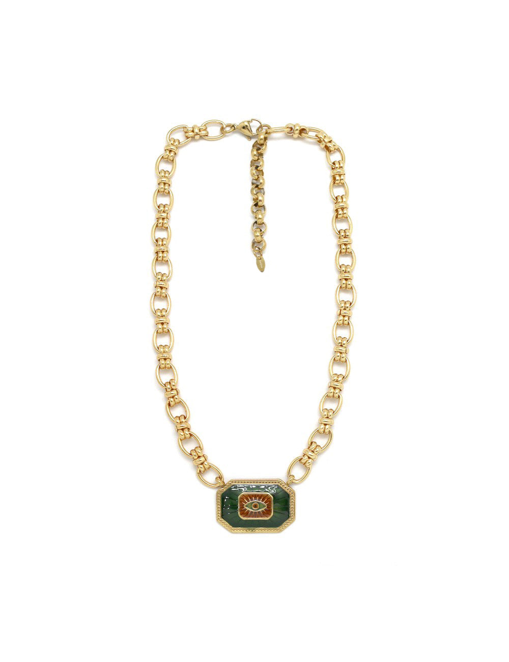 De Mirabelle Necklace is een echte statement piece. Een elegante gouden stainless-steel ketting met een unieke bedel, versierd met een groene steen en een oogdetail dat symbool staat voor bescherming en kracht.