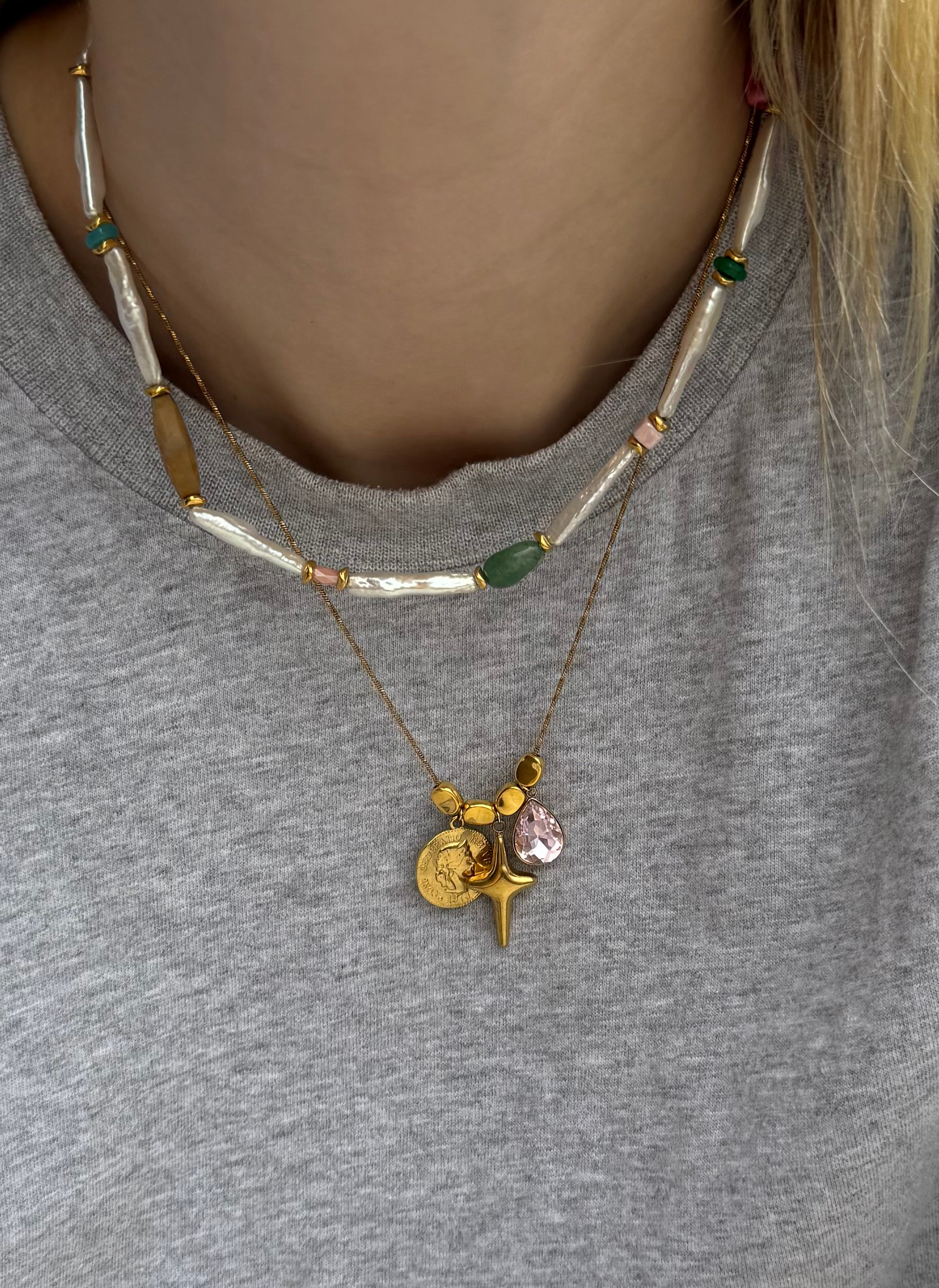 Maak kennis met onze Solenne Necklaces, waar elke ketting een speelse mix van unieke bedels bevat die jouw look helemaal afmaken! Deze charmante kettingen voegen net dat beetje extra flair toe aan je outfit. Of je nu houdt van een subtiel statement of een iets gedurfdere stijl, er is altijd wel een charm necklace die perfect bij je past.