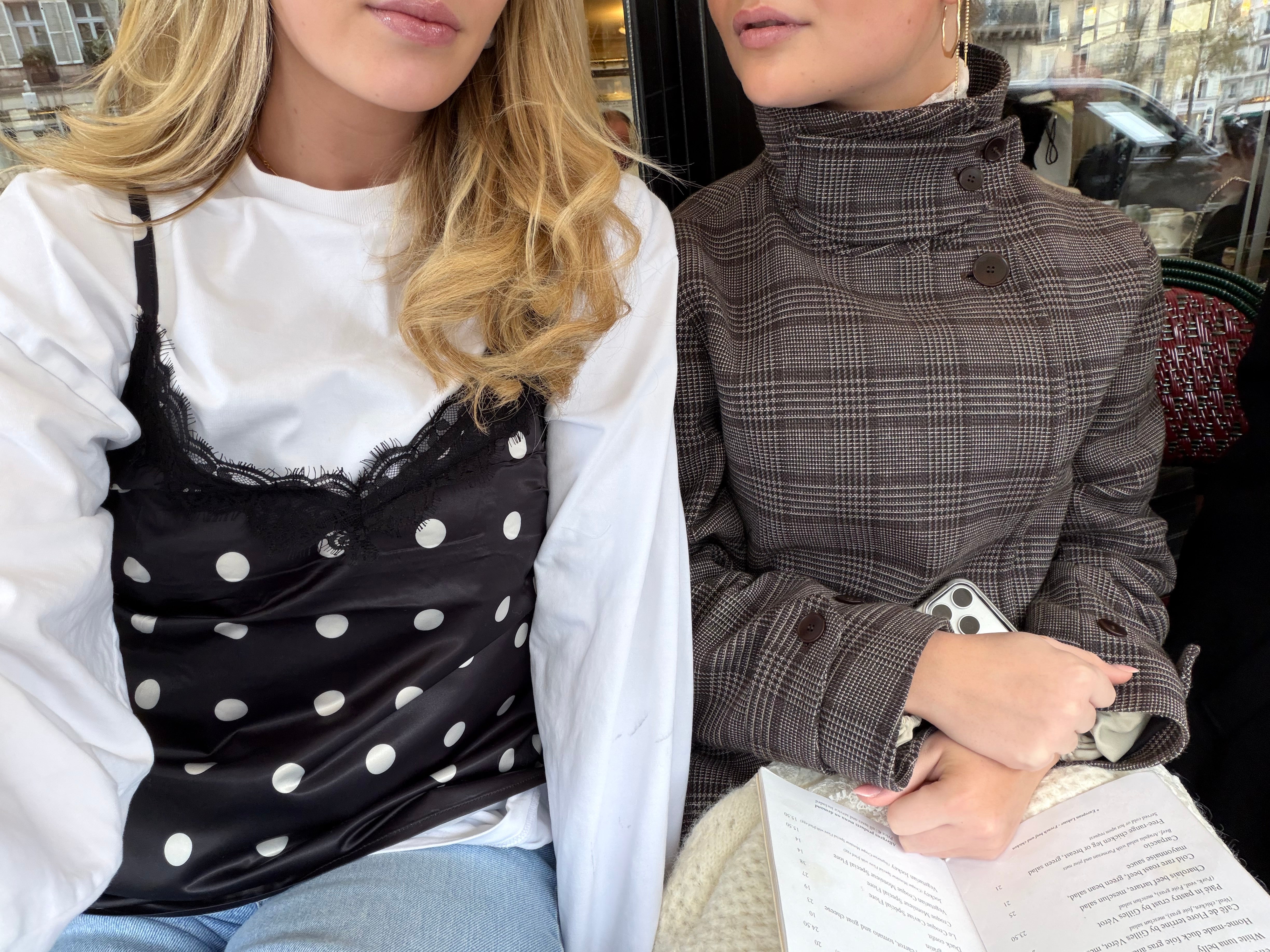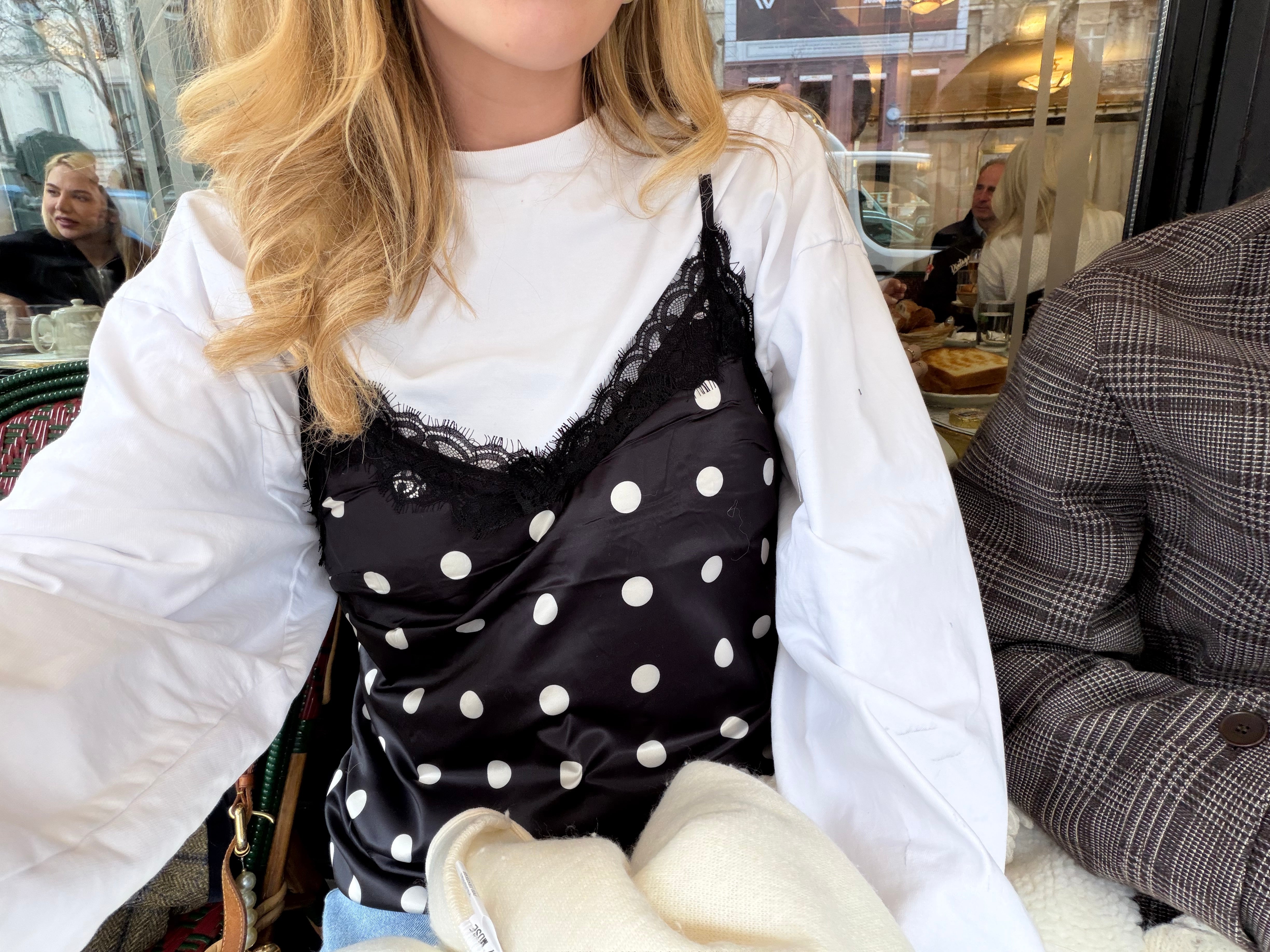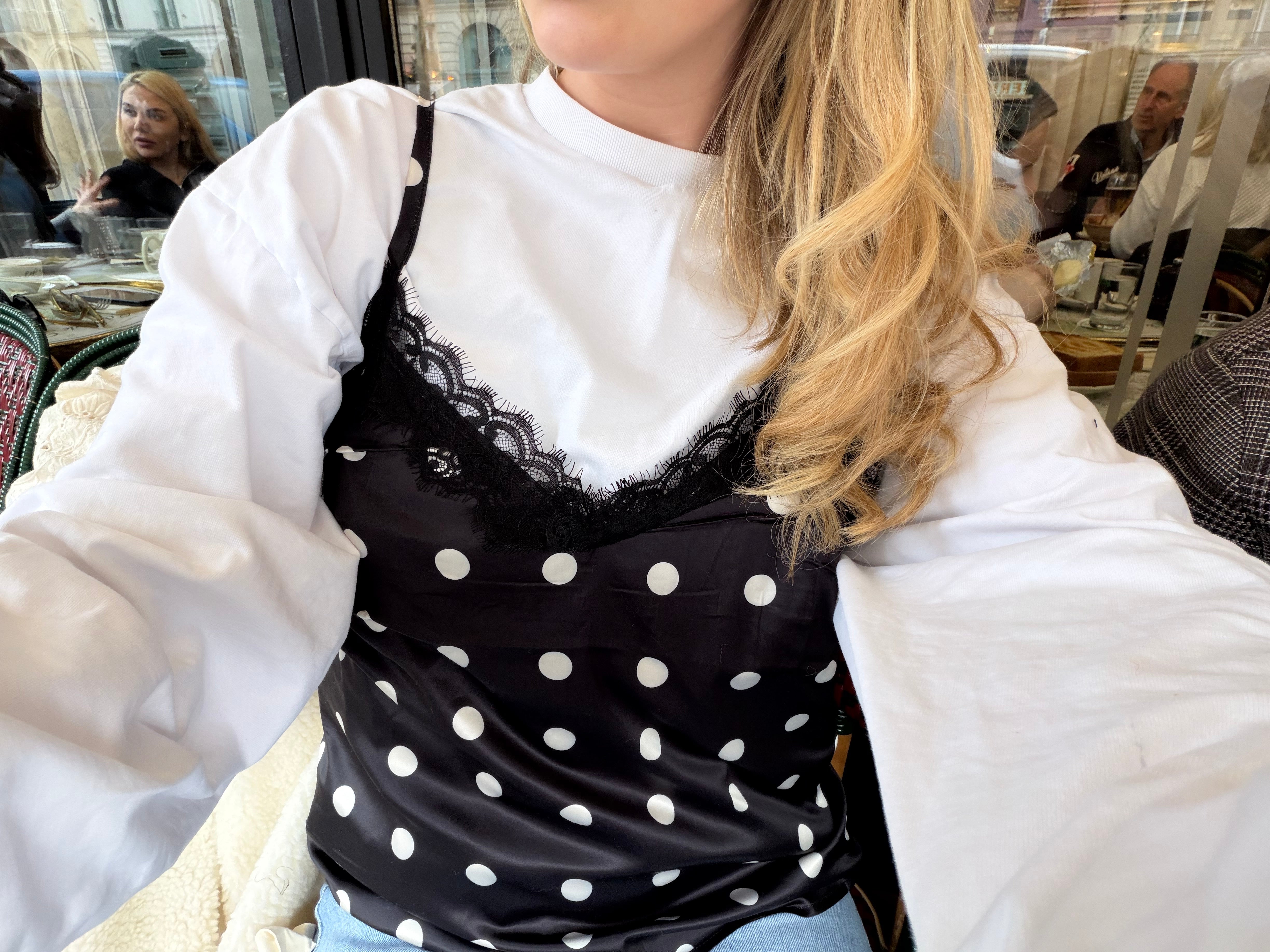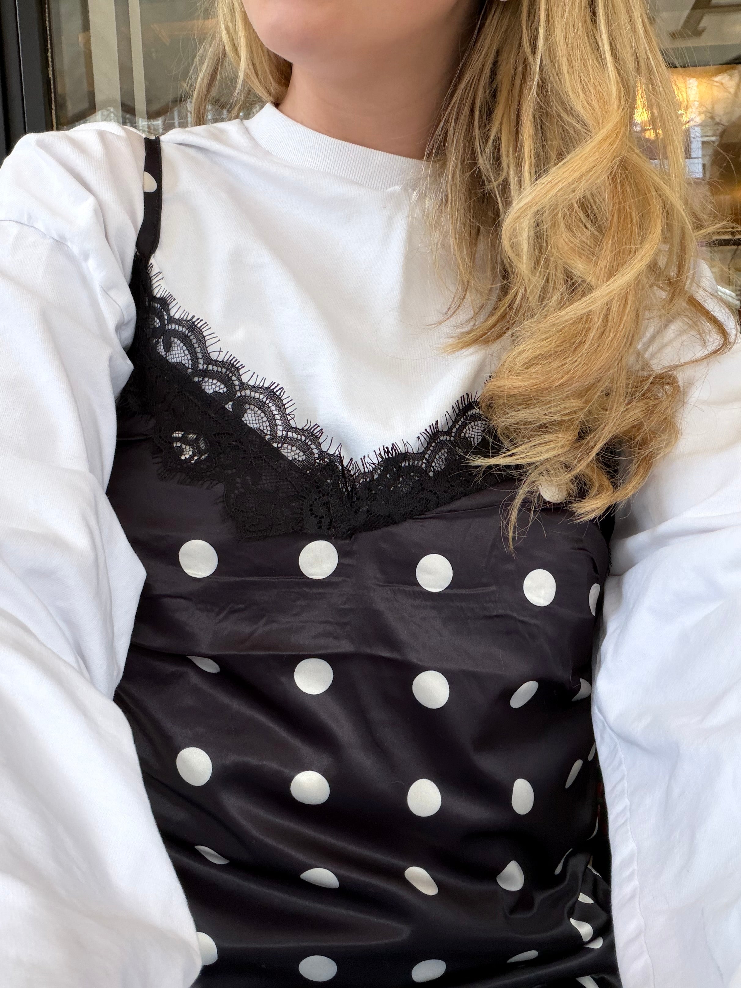 De Daisy Top is een stijlvolle stippentop met een subtiel stukje kant, wat zorgt voor een vrouwelijke en elegante uitstraling. De top wordt geleverd inclusief het witte shirt, waardoor je direct een complete en gelaagde look creëert.