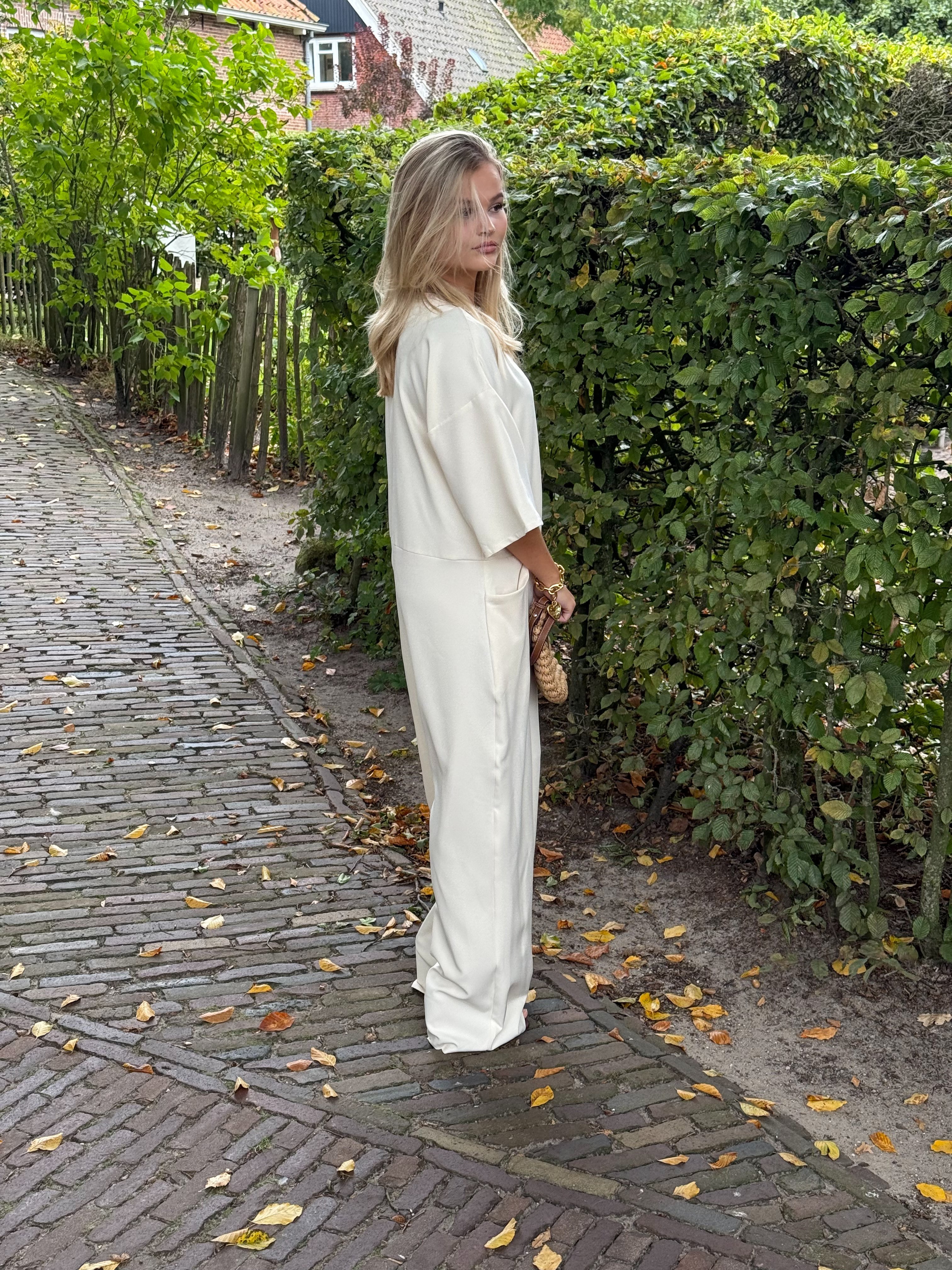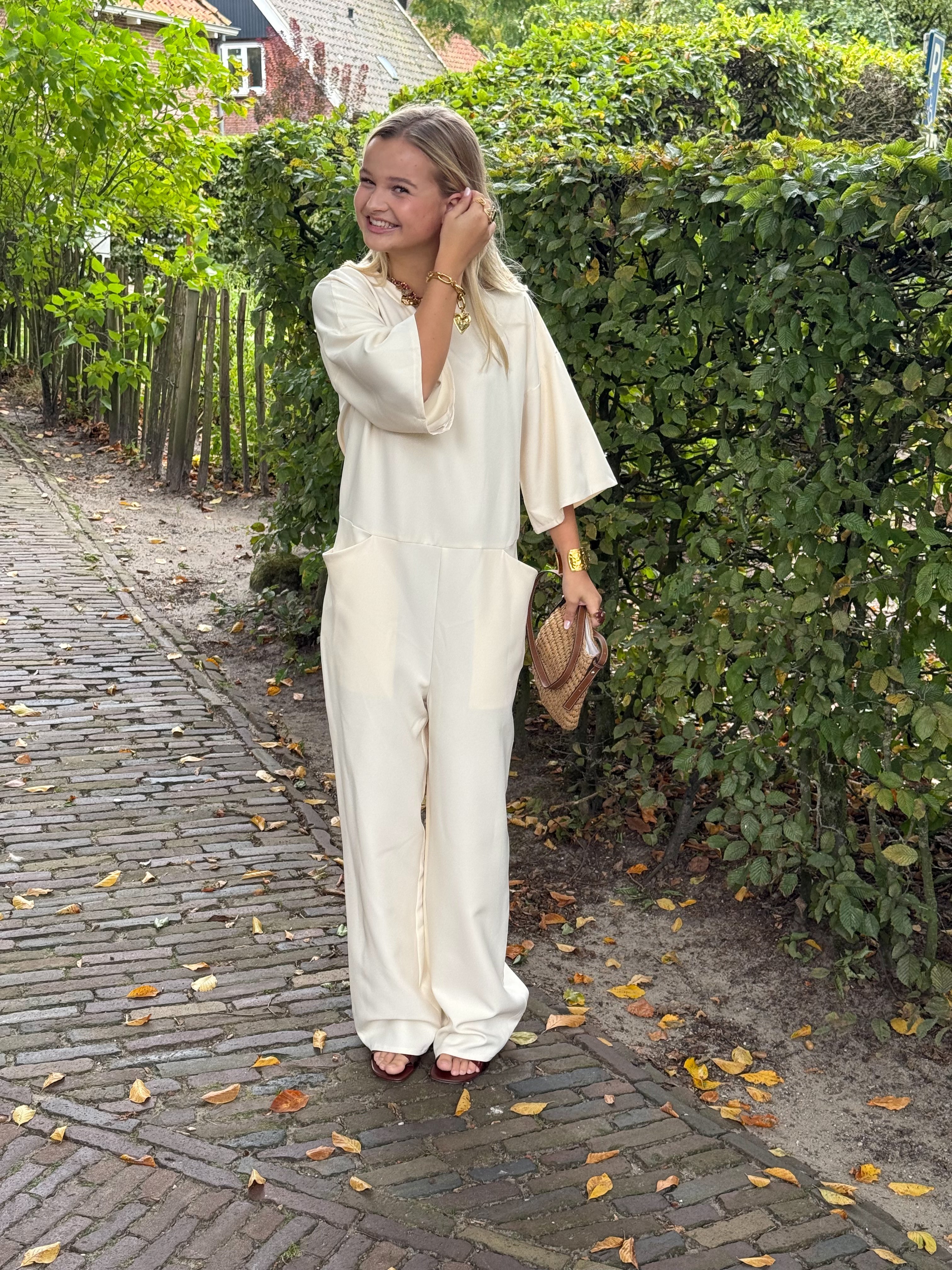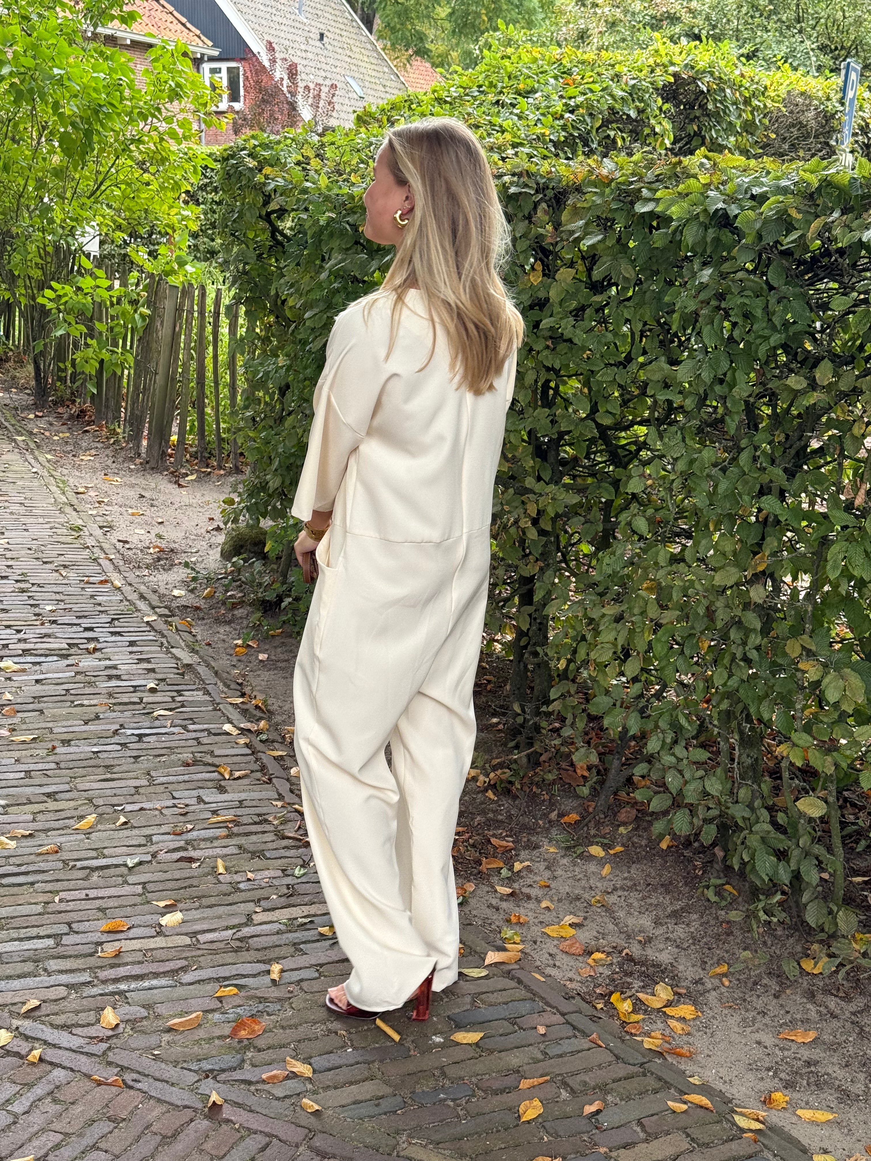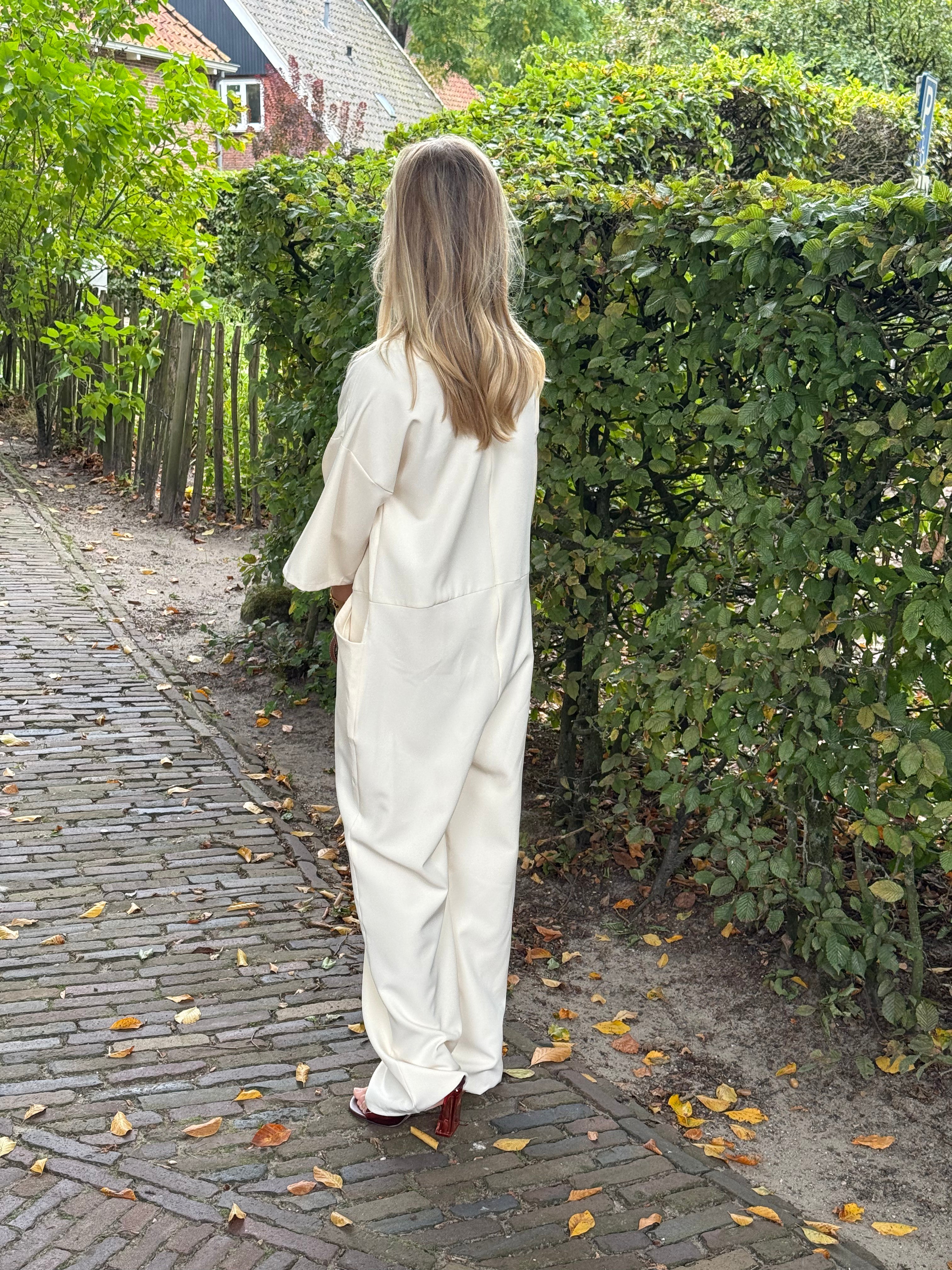 Een elegante jumpsuit in een zachte crèmekleur, gemaakt van een hoogwaardige, soepelvallende stof die mooi meebeweegt. Het ontwerp heeft een flatterende pasvorm met een lange broekspijp en een ¾-pofmouw, waardoor hij zowel stijlvol als comfortabel is. Perfect voor zowel een chique gelegenheid als een casual dag.