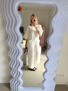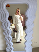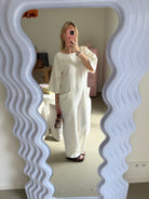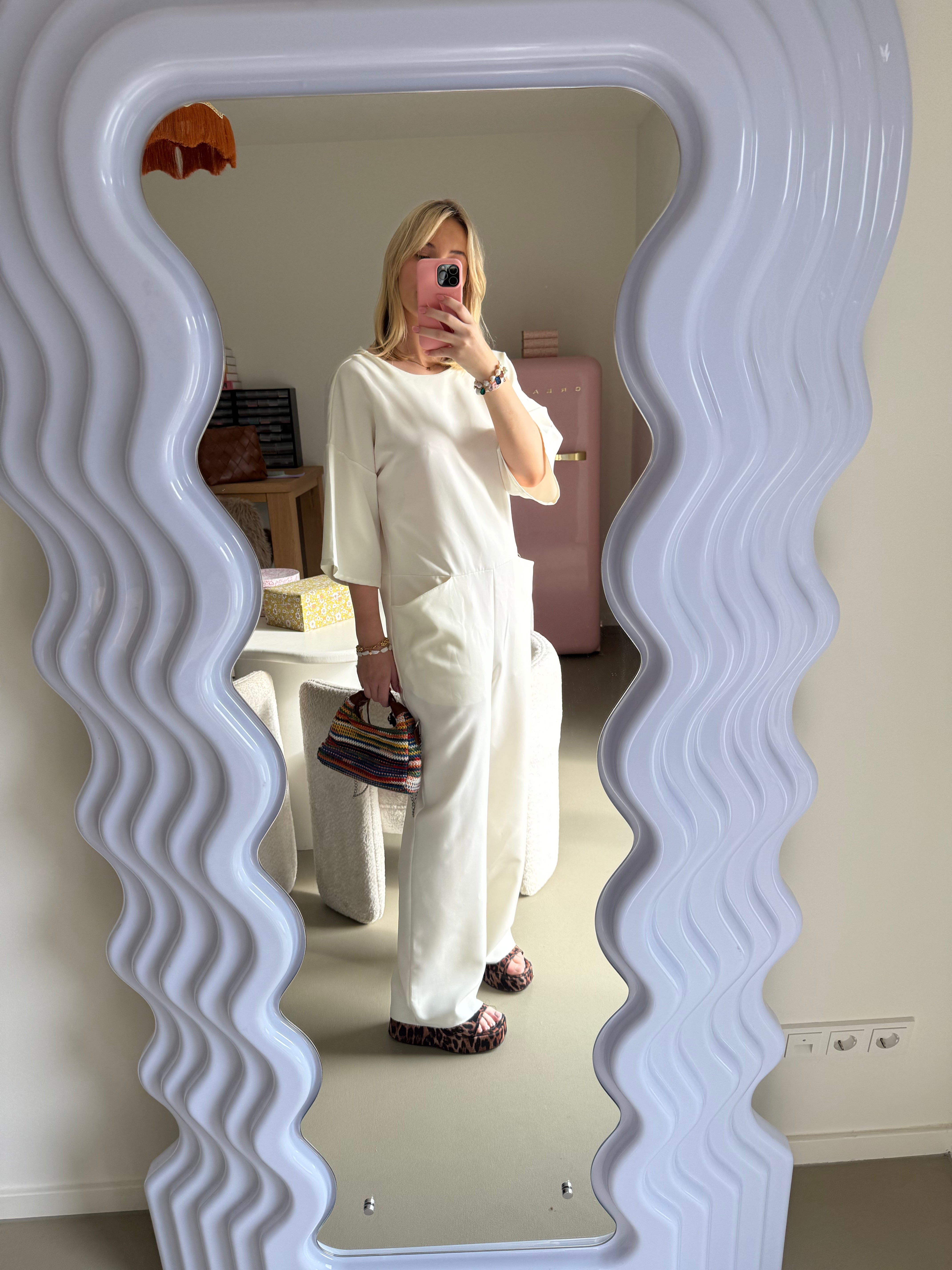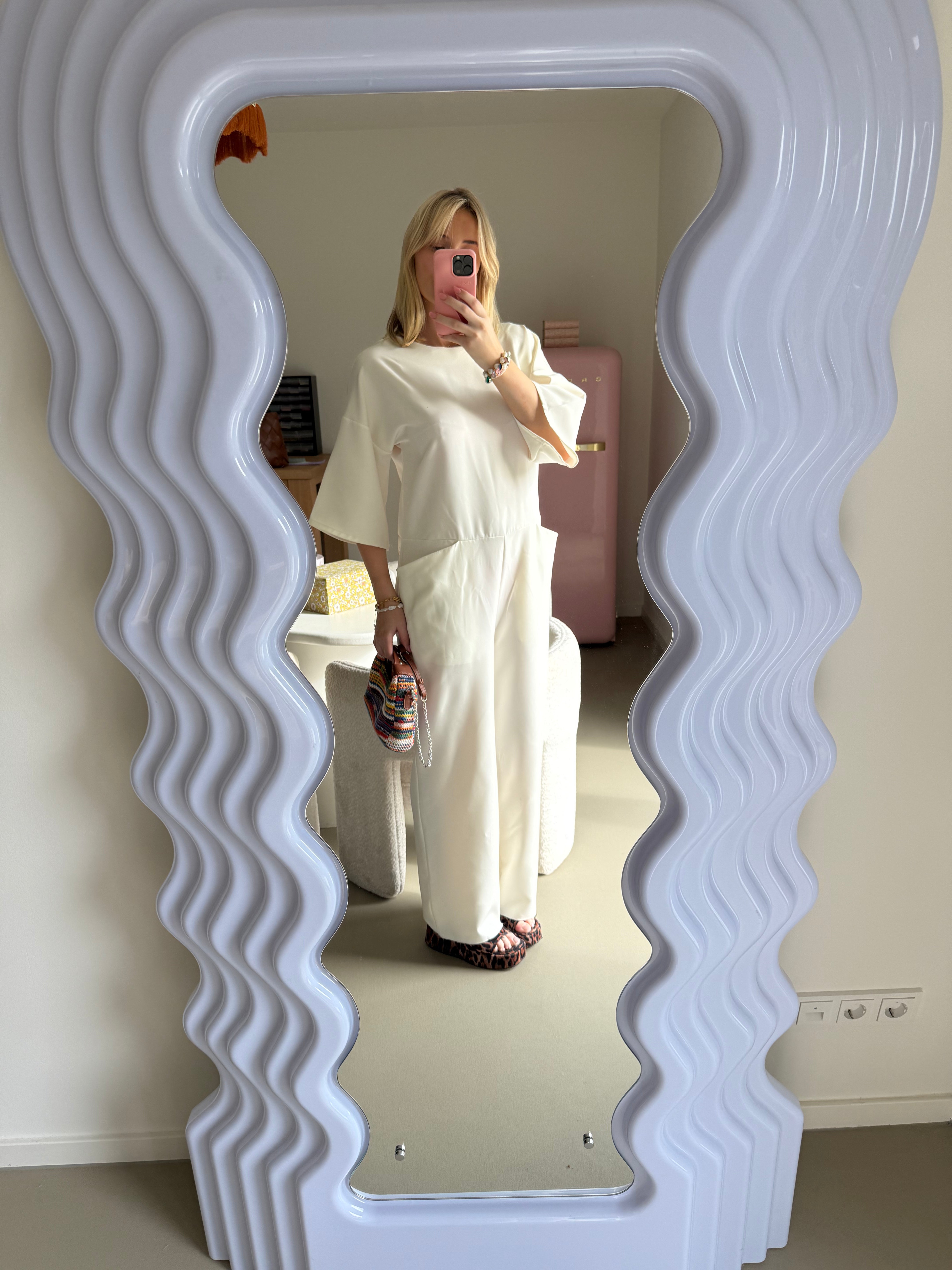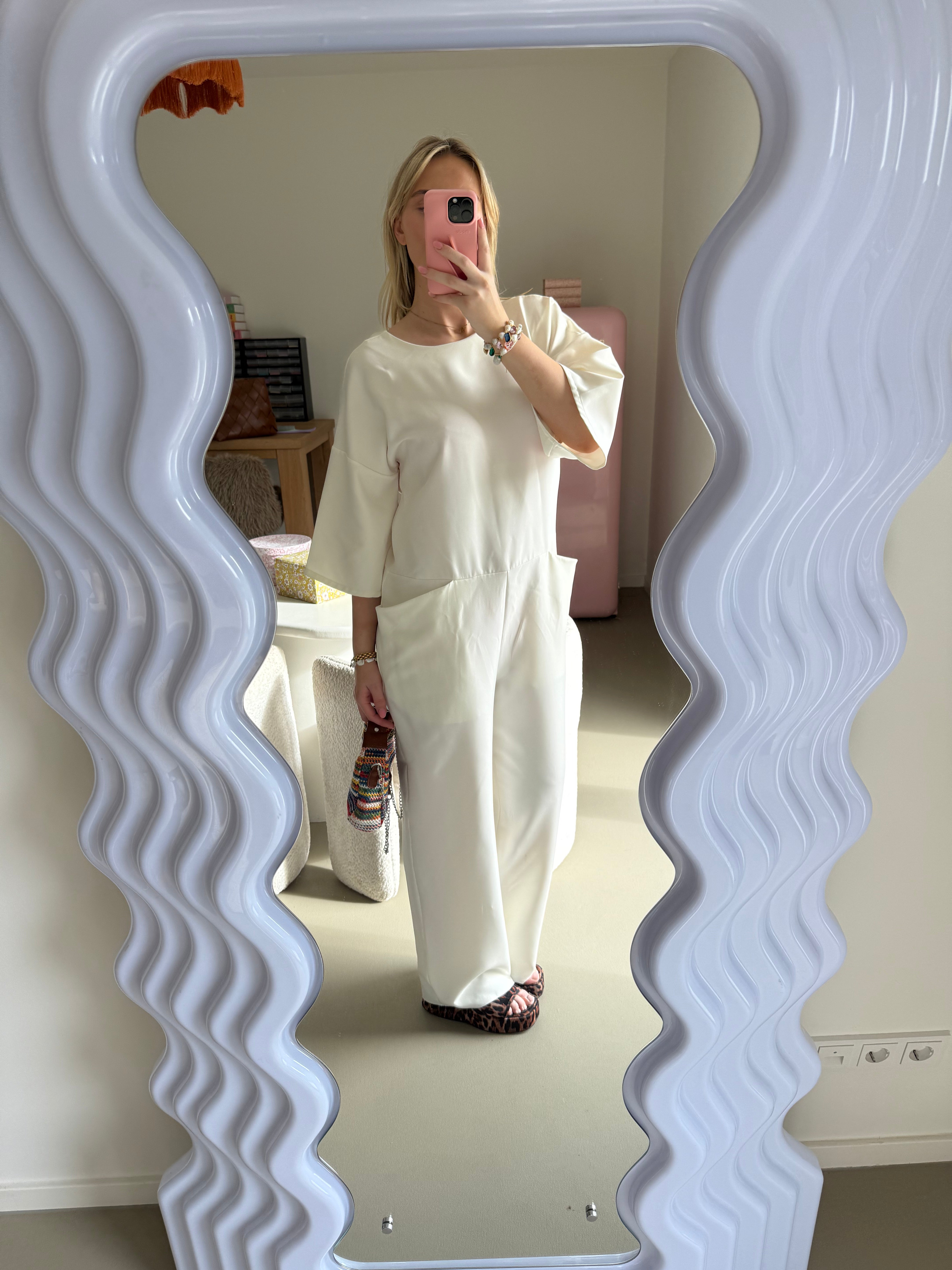 Een elegante jumpsuit in een zachte crèmekleur, gemaakt van een hoogwaardige, soepelvallende stof die mooi meebeweegt. Het ontwerp heeft een flatterende pasvorm met een lange broekspijp en een ¾-pofmouw, waardoor hij zowel stijlvol als comfortabel is. Perfect voor zowel een chique gelegenheid als een casual dag.