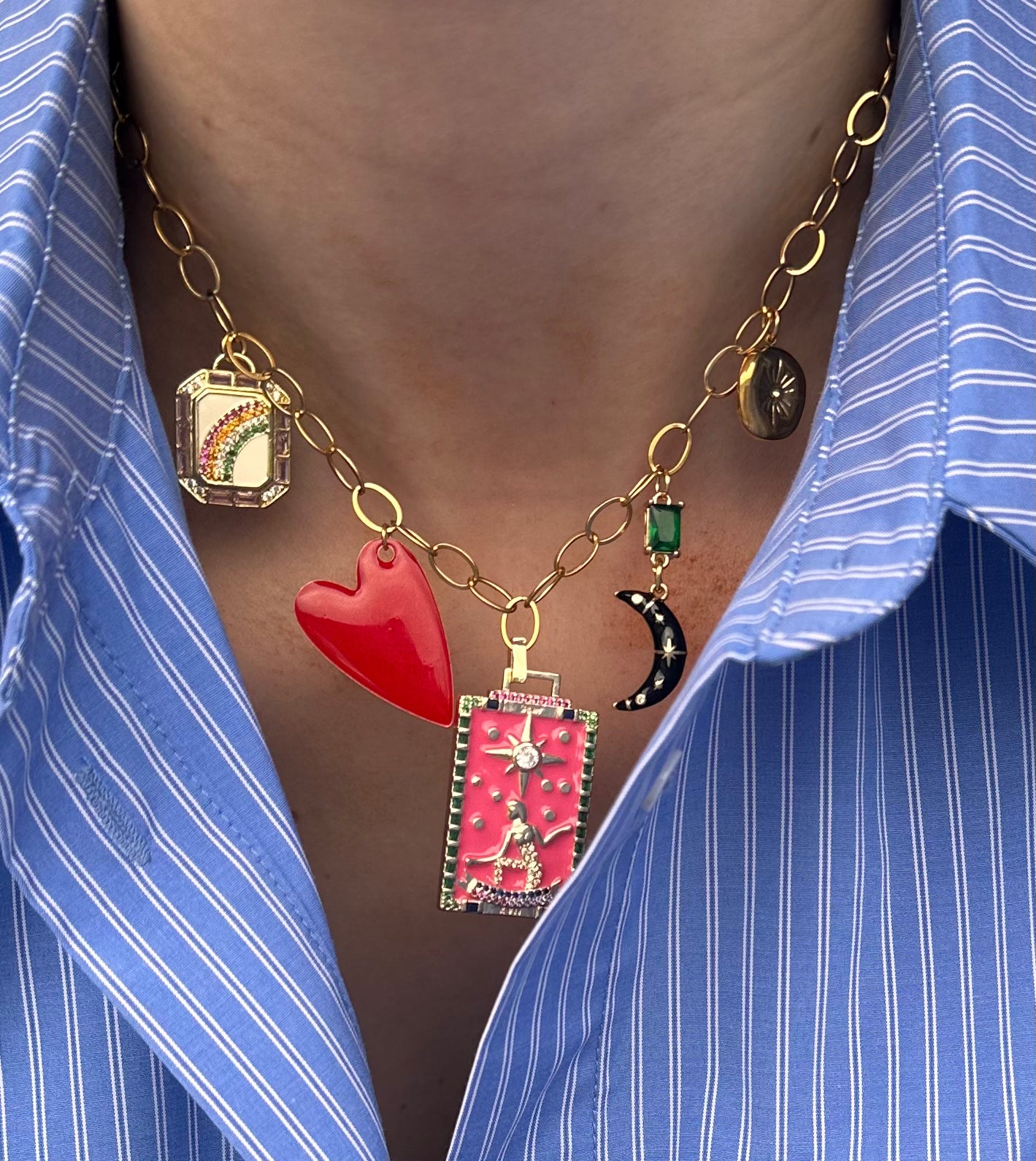 De Blair Necklace is een uniek sieraad dat bestaat uit stevige, opvallende schakels en prachtige bedels. Wat deze ketting echt bijzonder maakt, is het feit dat elk exemplaar uniek is. Elke ketting kan op maat worden gemaakt, waardoor je de mogelijkheid hebt om de bedels en andere elementen aan te passen, zodat jouw ketting volledig aan jouw persoonlijke smaak en stijl voldoet. Hierdoor krijg je een prachtig sieraad.