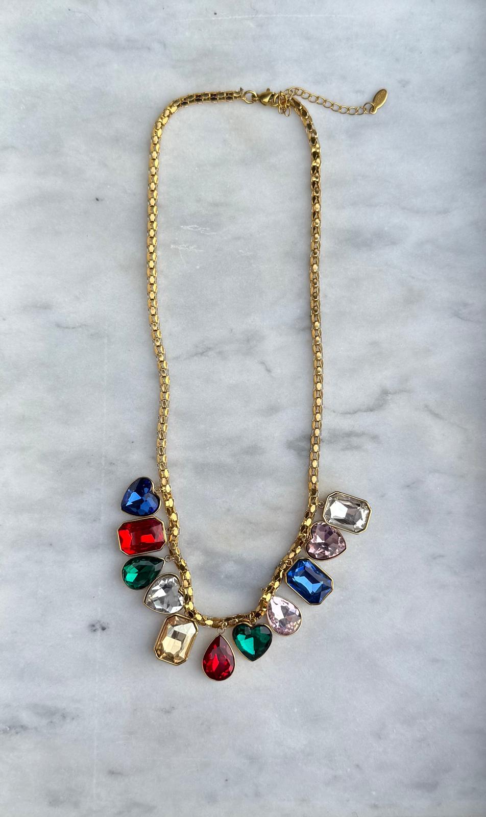De ketting is versierd met sprankelende, kleurrijke kristallen en edelsteenaccenten, die schitteren bij iedere beweging en lichtval. Perfect om je outfit een vrolijke, elegante touch te geven, van casual tot feestelijk.