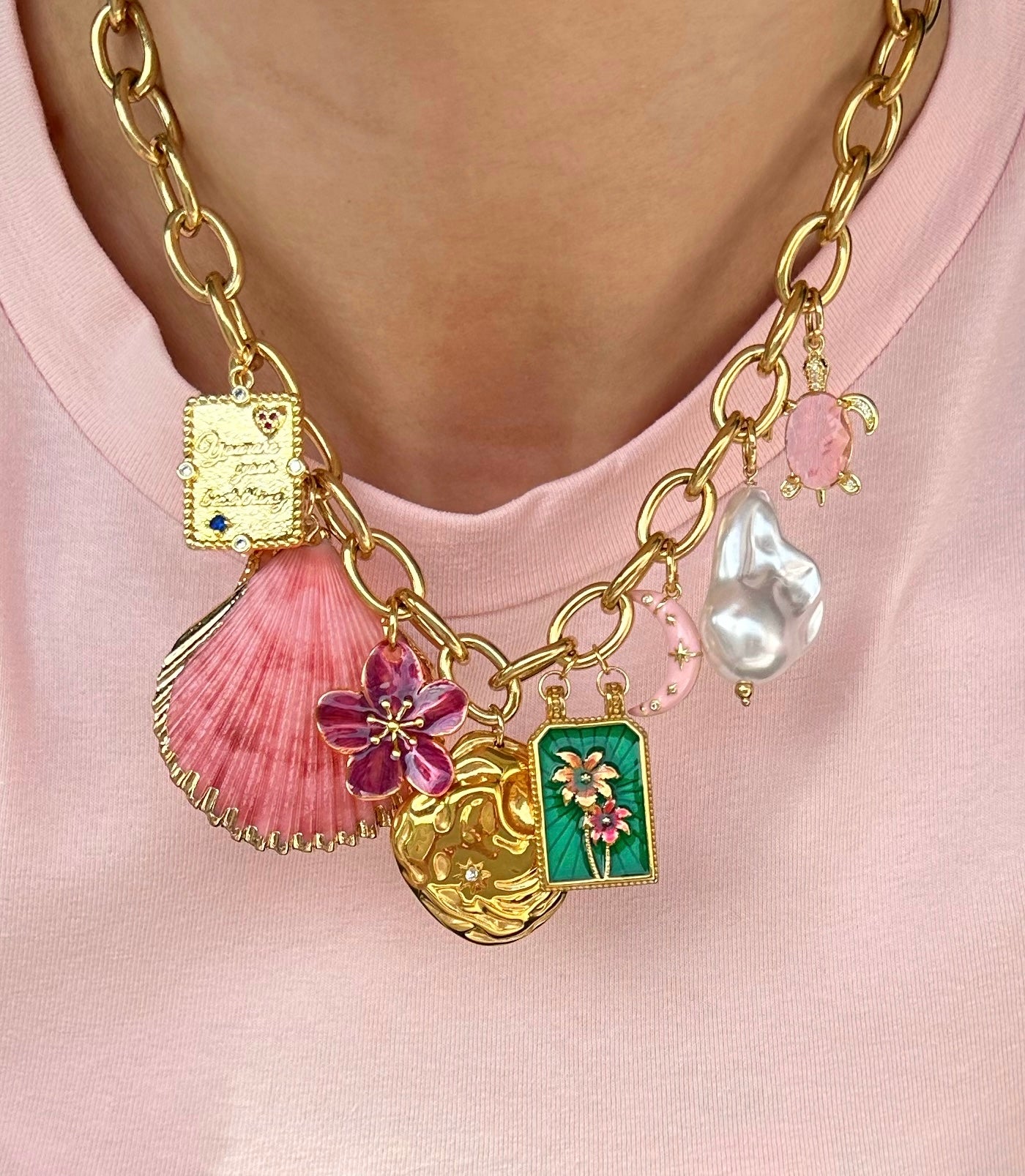 Deze Kiki Necklace is een uniek sieraad dat bestaat uit stevige, opvallende schakels en prachtige bedels. Wat deze ketting echt bijzonder maakt, is het feit dat elk exemplaar uniek is. Elke ketting kan op maat worden gemaakt, waardoor je de mogelijkheid hebt om de bedels en andere elementen aan te passen, zodat jouw ketting volledig aan jouw persoonlijke smaak en stijl voldoet. Hierdoor krijg je een prachtig sieraad.
