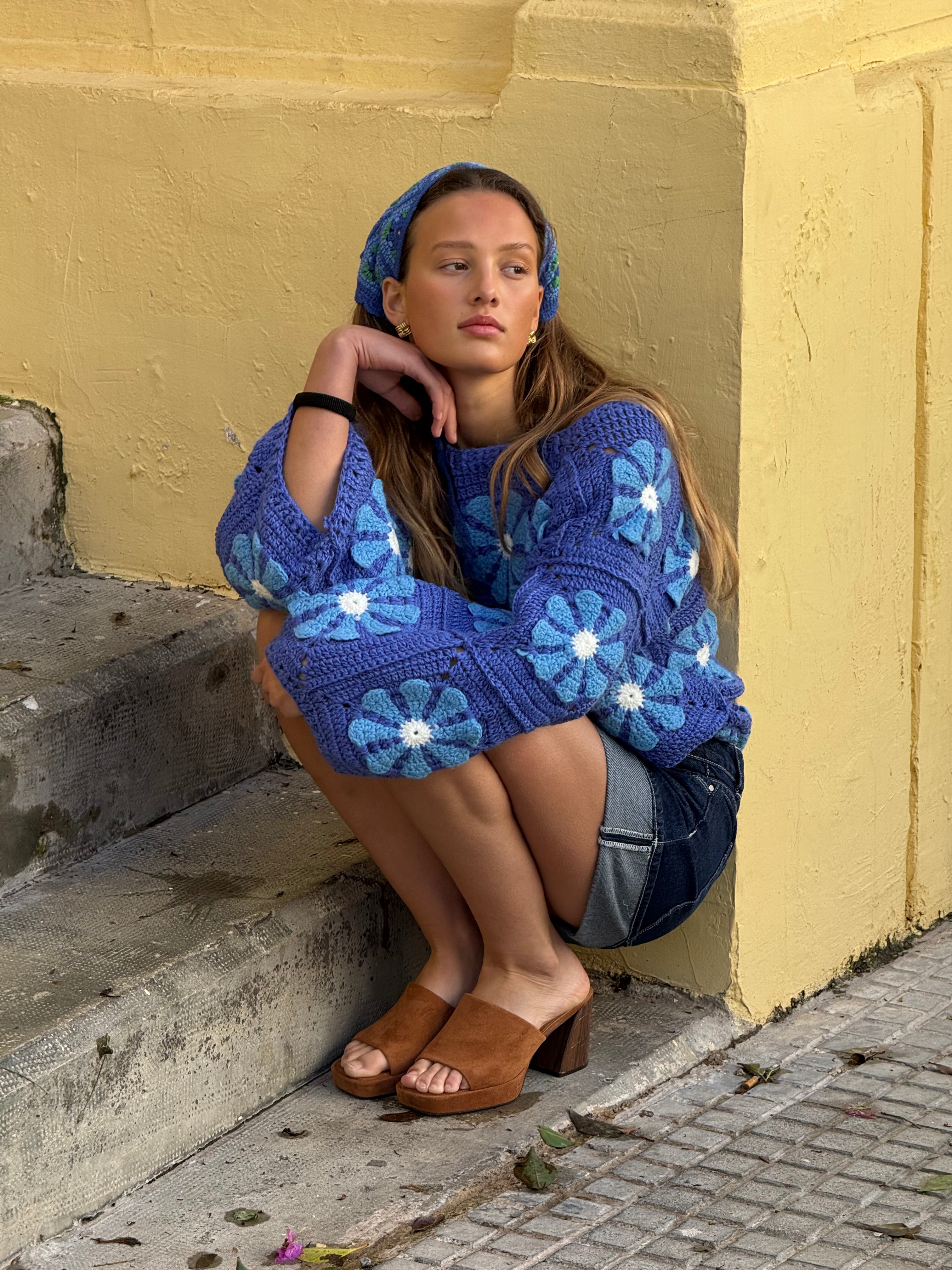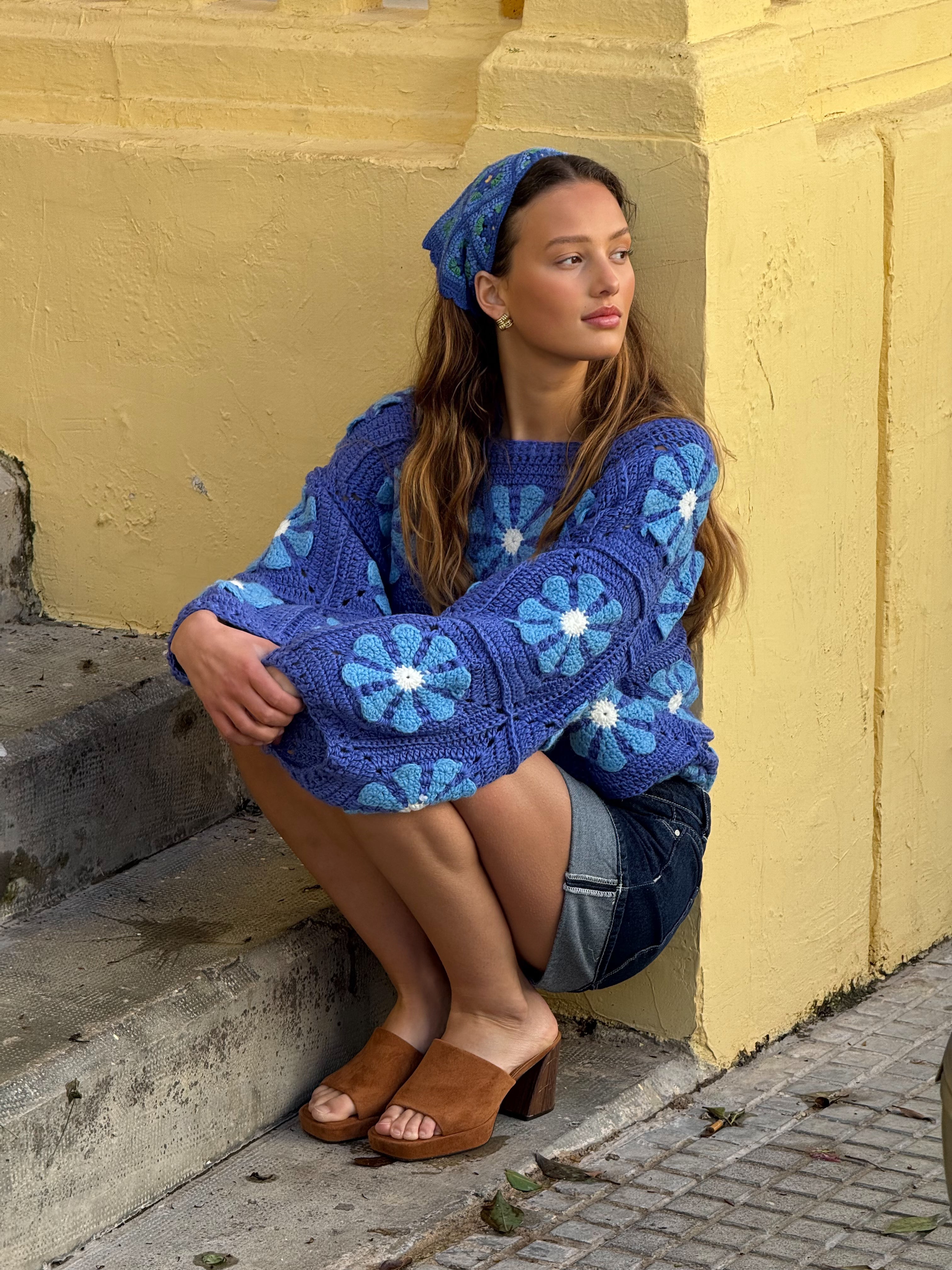 Deze prachtige blauwe knit is de perfecte mix van comfort en stijl! De lange, dikke trui voelt heerlijk zacht aan en is ideaal om je lekker in te wikkelen. Wat deze knit extra bijzonder maakt, zijn de subtiele bloemdetails die erin verwerkt zijn, waardoor hij ook perfect te dragen is op zomerse dagen voor een speelse en frisse look.