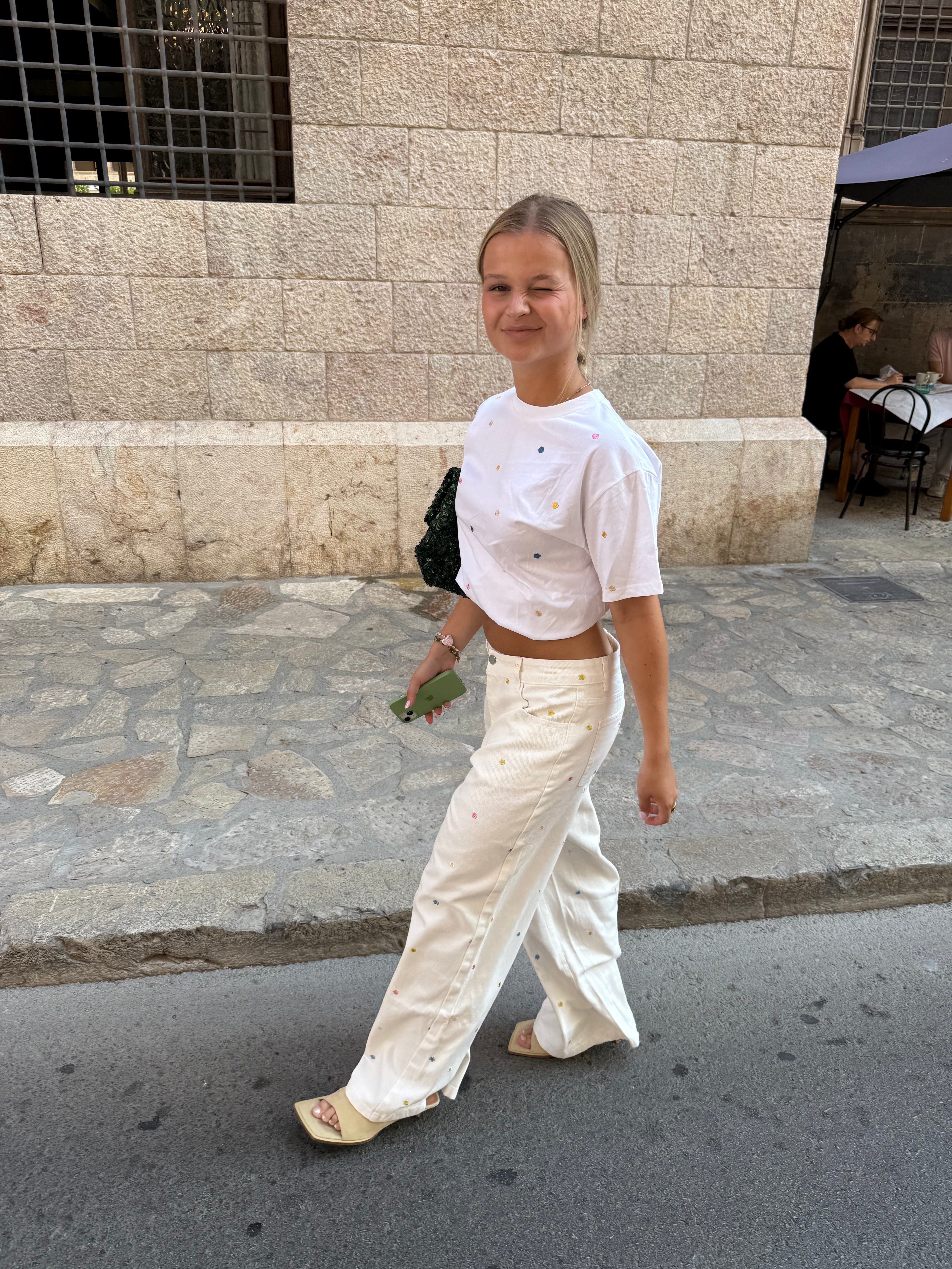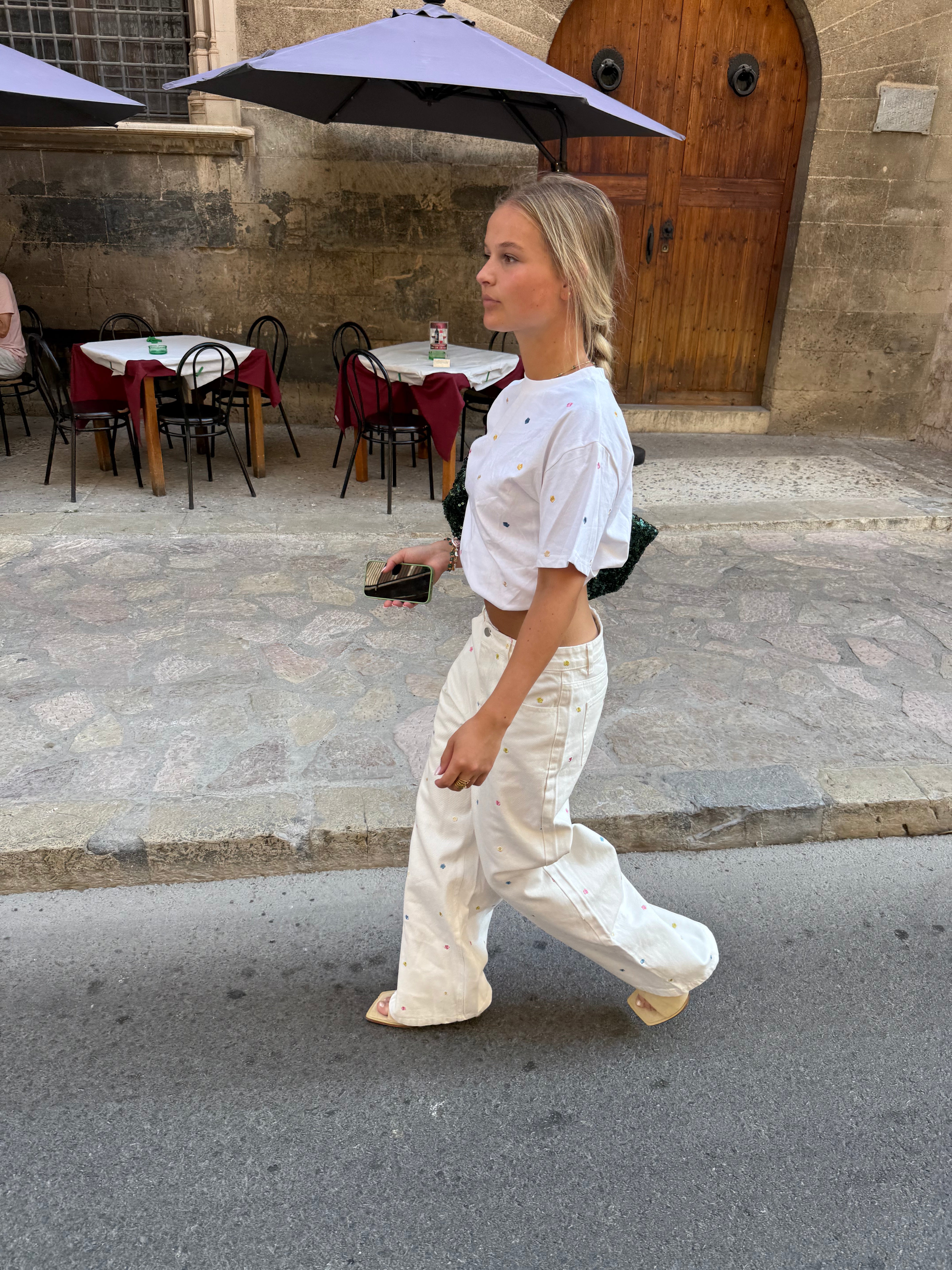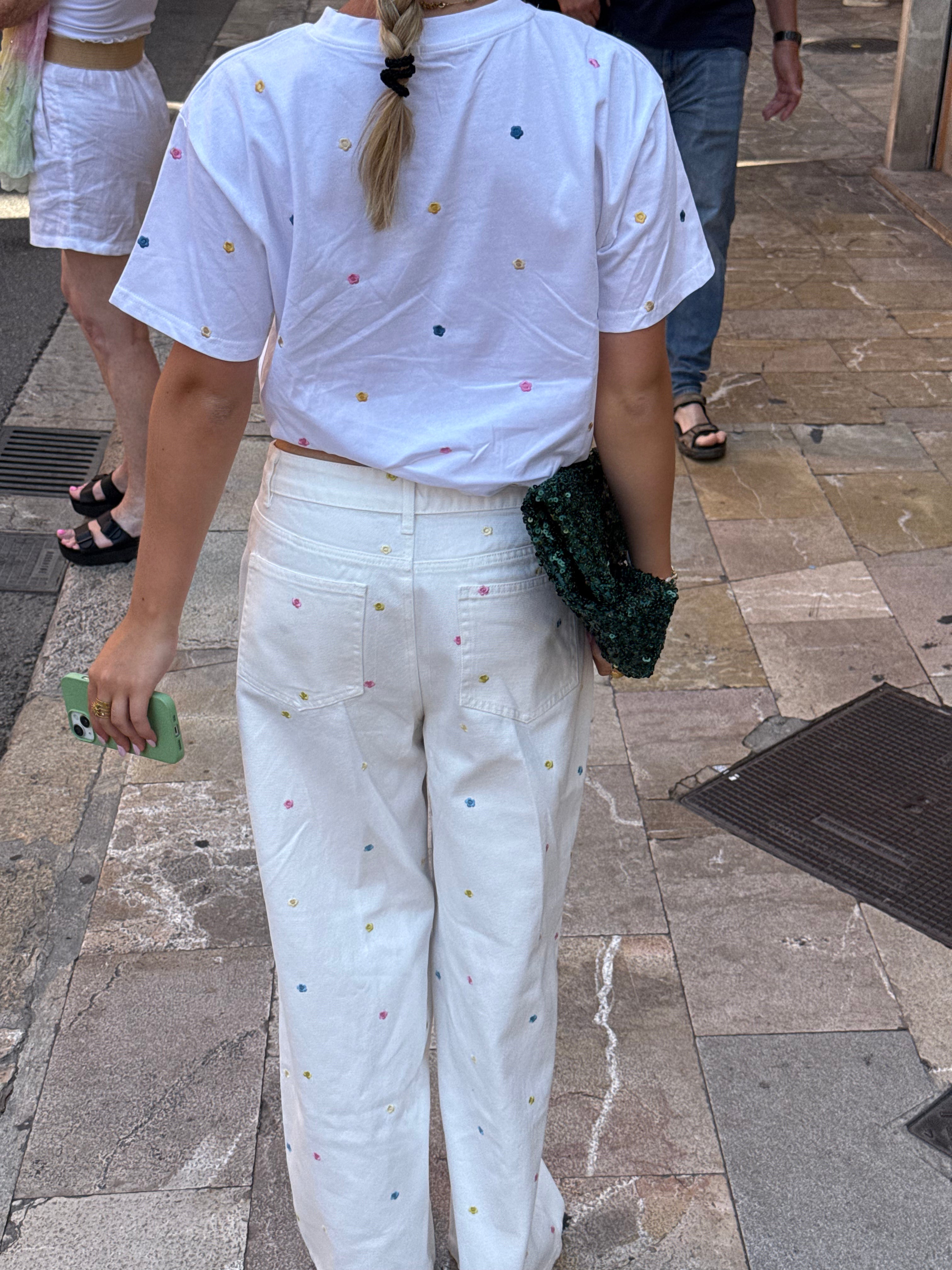 Ontdek de perfecte harmonie tussen comfort en verfijning met ons katoenen shirt, rijkelijk versierd met kleurrijke, met de hand geborduurde bloemen die als kleine kunstwerkjes op het zachte katoen tot leven komen. Elke bloem vertelt een verhaal van vakmanschap en liefde voor detail, waardoor dit shirt niet zomaar een basic is, maar een expressie van stijl en persoonlijkheid. Draag het als een stralend middelpunt van je outfit, gecombineerd met onze bijpassende jeans, en straal moeiteloos een natuurlijke elegantie uit – ideaal voor wie durft te schitteren, elke dag opnieuw.
