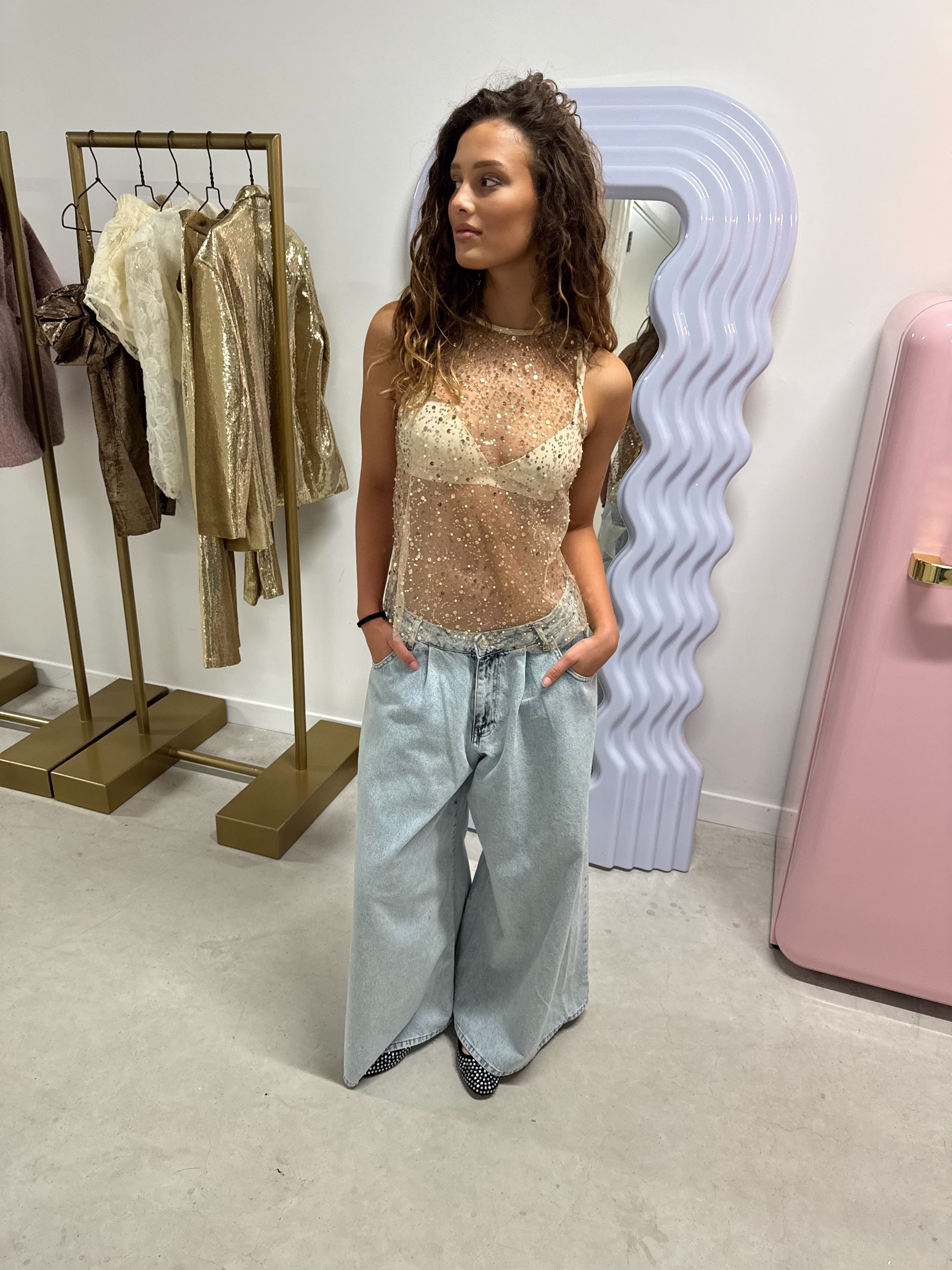 Deze transparante glittertop is de ultieme party must-have voor de feestdagen! 🌟 Met zijn sprankelende glitterdetails en doorzichtige stof is het de perfecte keuze om een statement te maken. Superleuk om te stylen met een bralette, een opvallende bh of een simpele top eronder. zo creëer je je eigen unieke look!