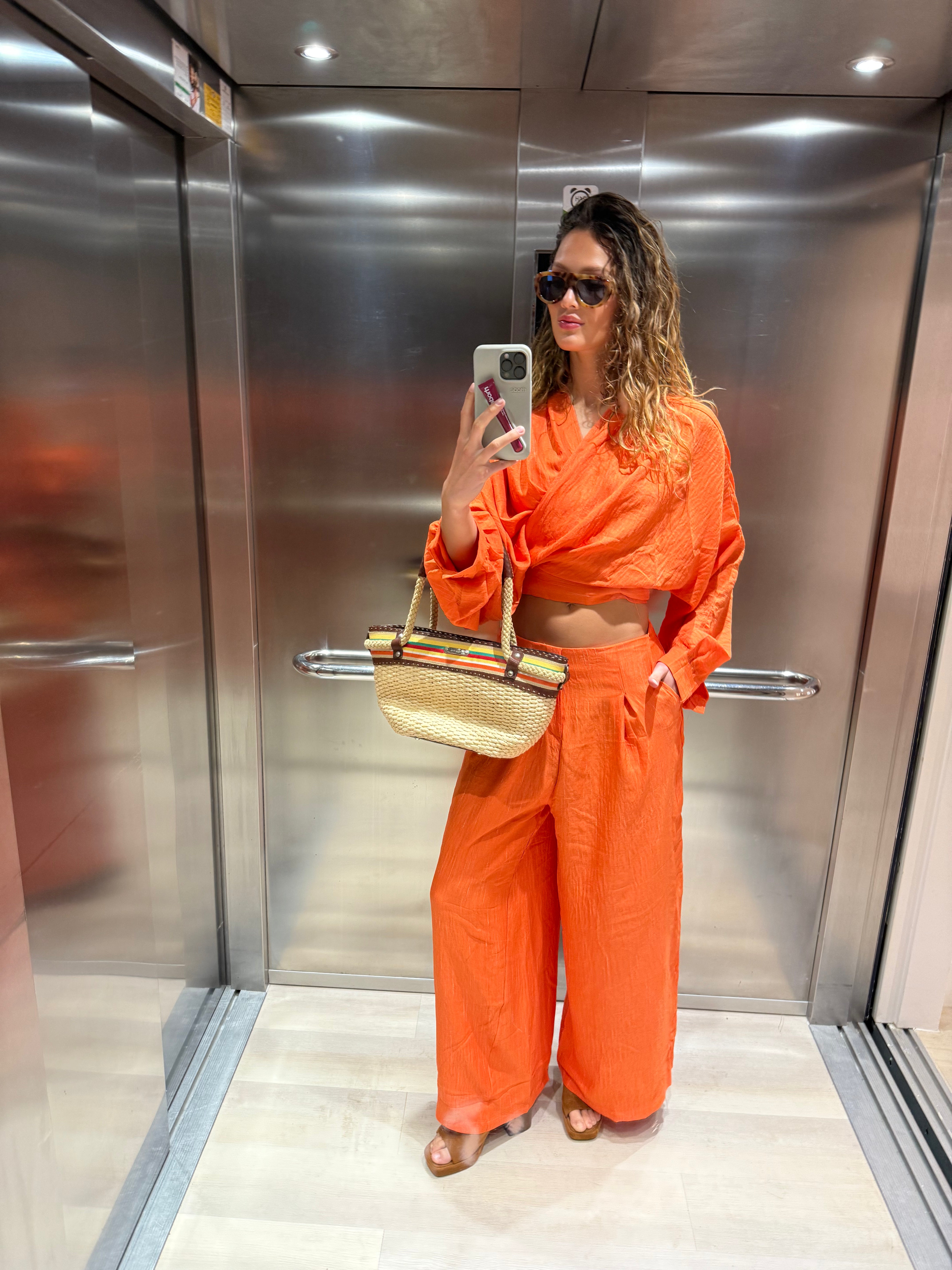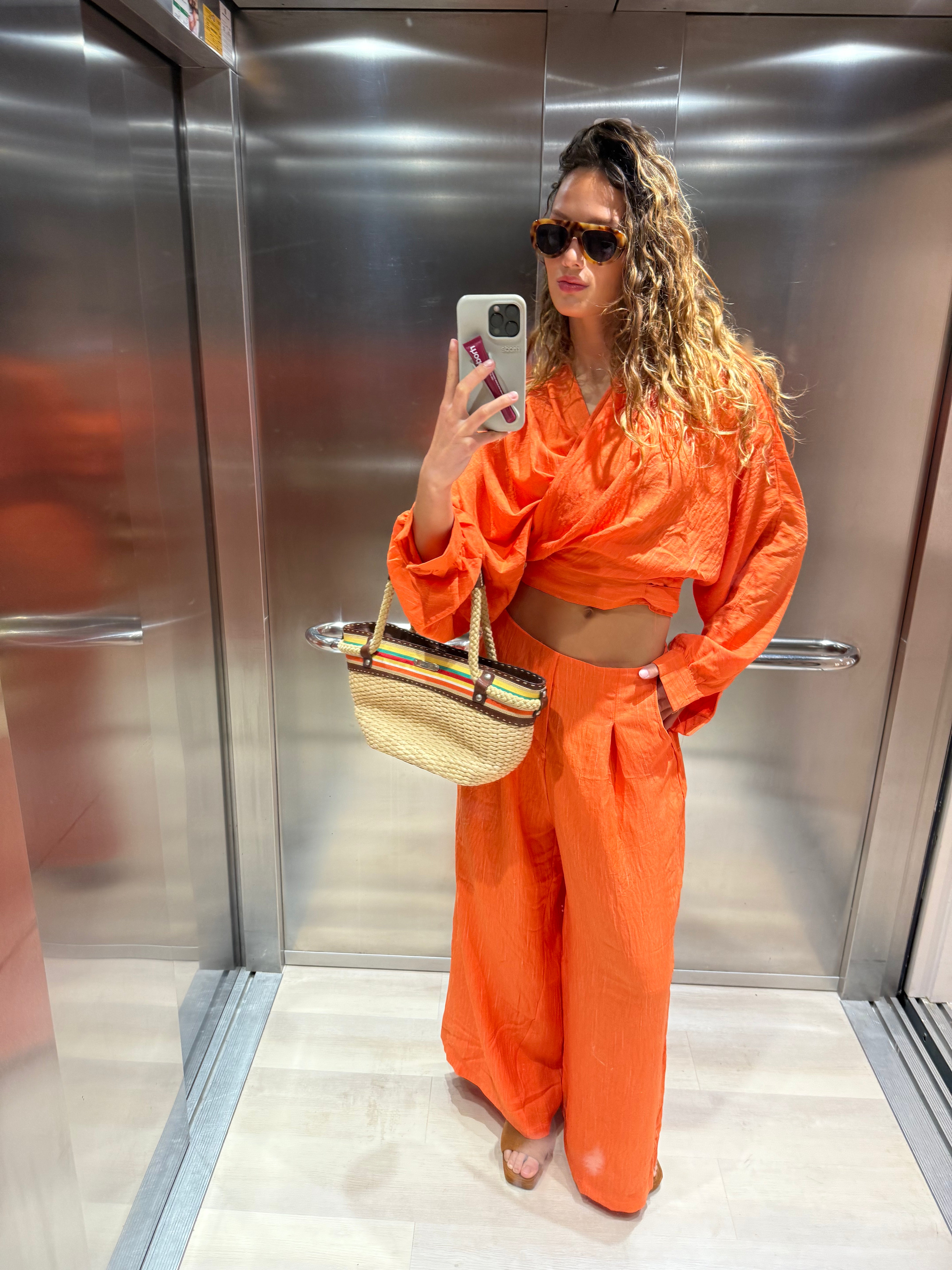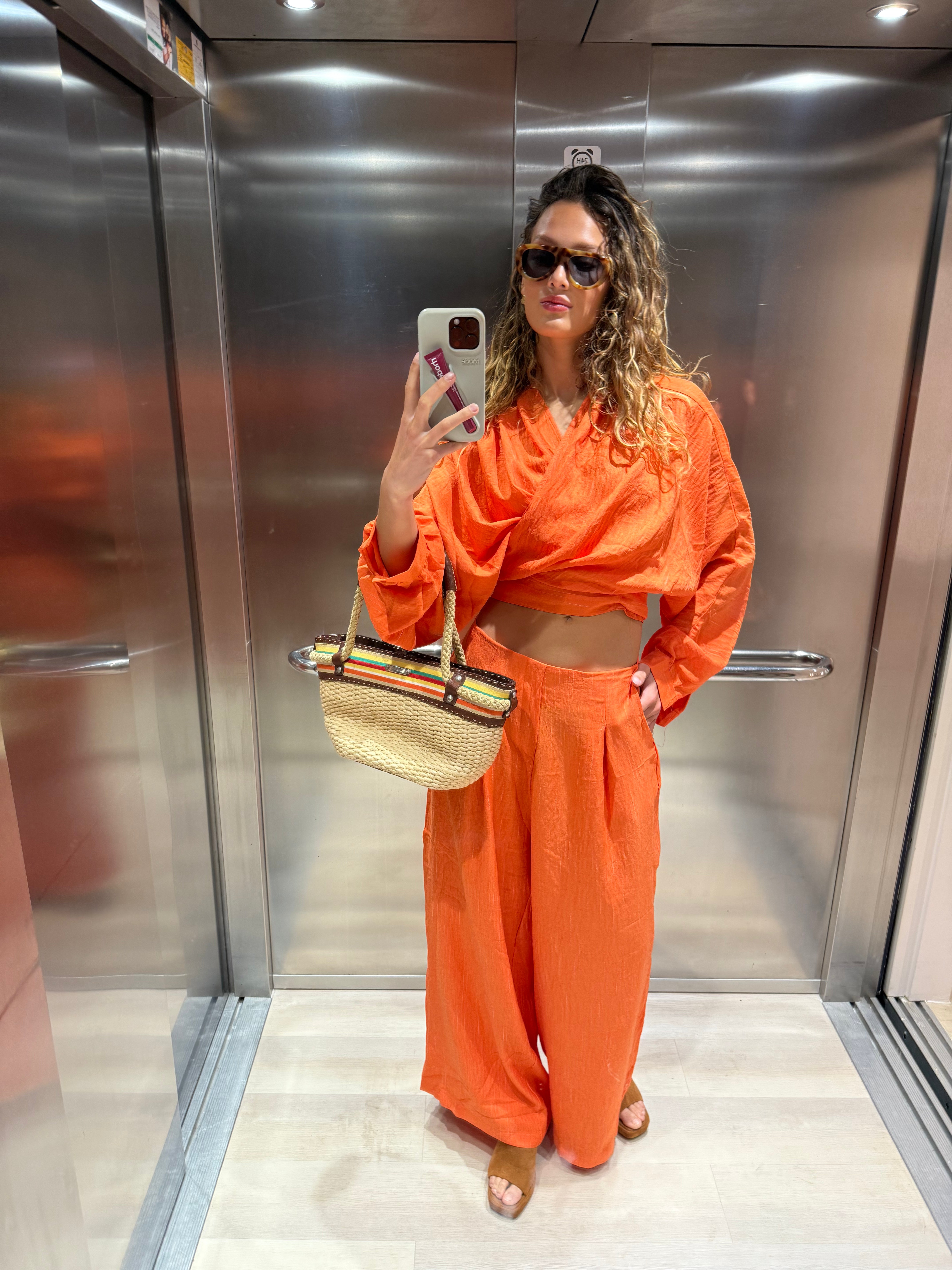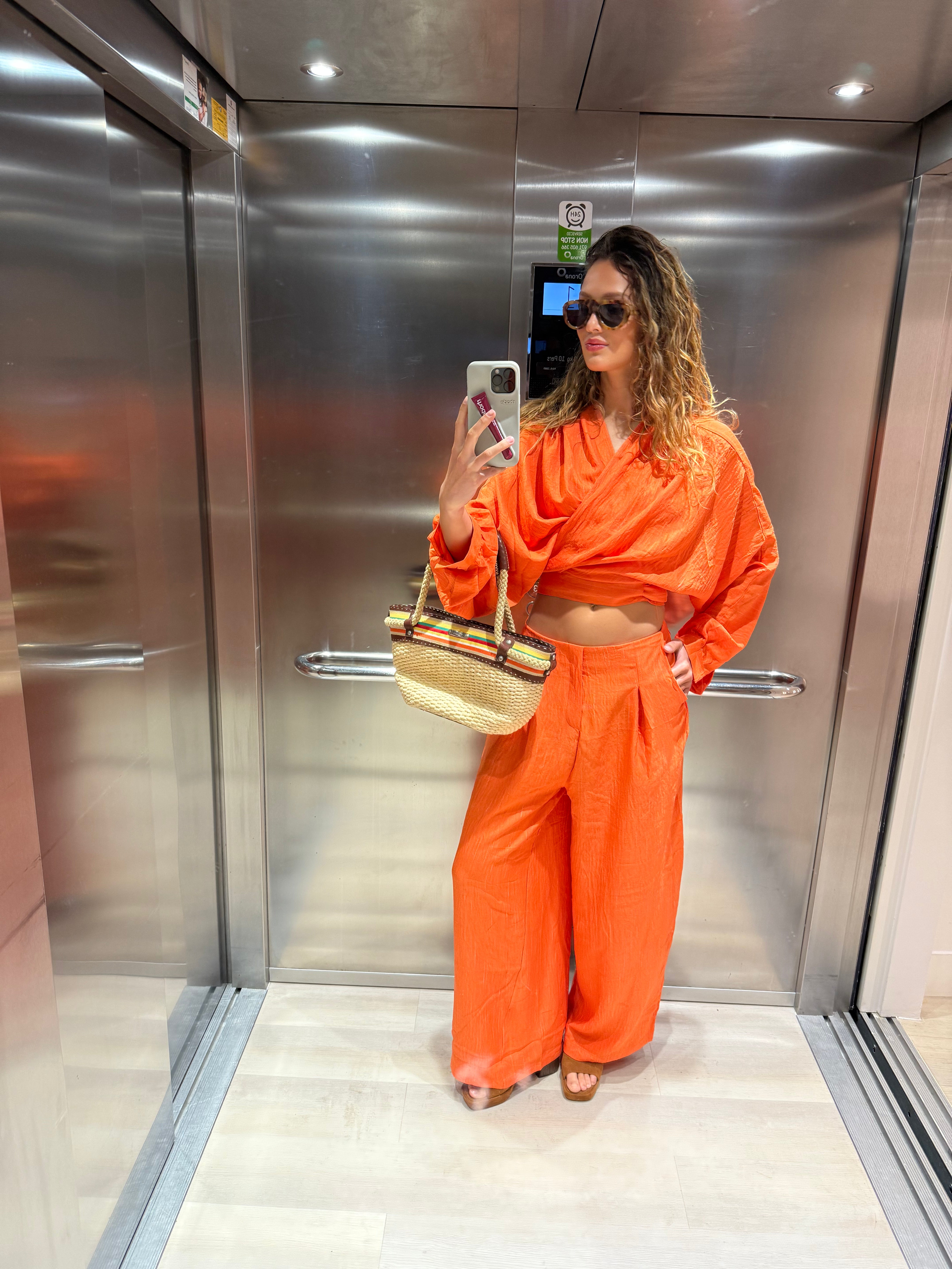 Wil je een echte eye-catcher toevoegen aan je garderobe? Dan is deze prachtige oranje set perfect voor jou! De set bestaat uit een lange broek en een bijpassende blouse met lange mouwen, waarmee je moeiteloos een trendy en chique look creëert.
