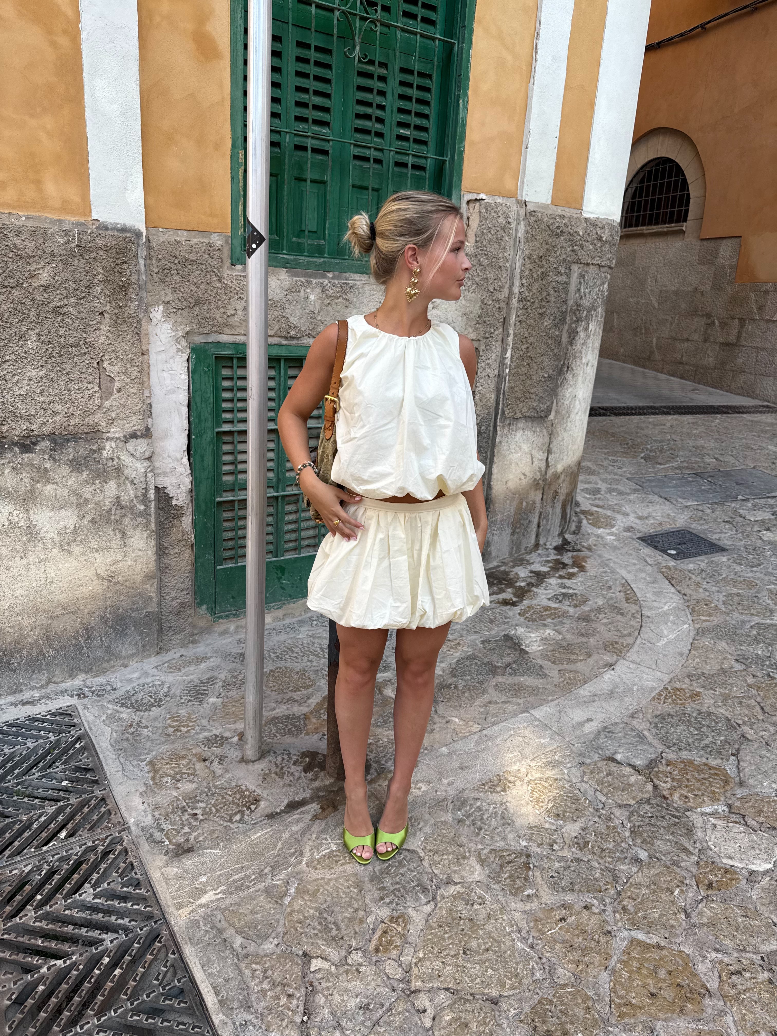 Deze bijzondere set is een echte eyecatcher, bestaande uit een prachtige top en een volumineuze pofrok in kartonnen design. Het speelse maar toch stijlvolle model maakt de set perfect voor wie houdt van iets unieks.